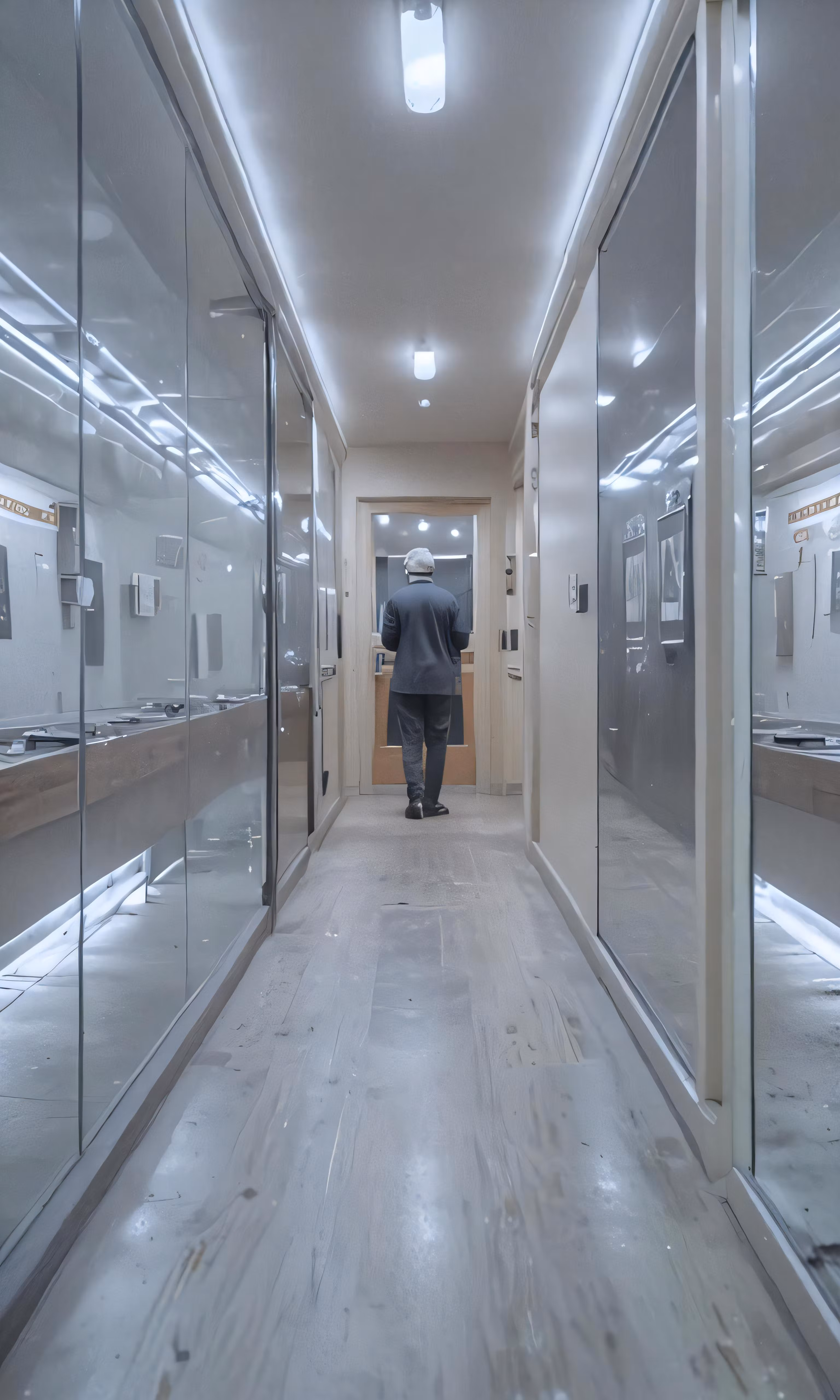 High resolution picture, free to use, the official logo for the 50 /a person is walking down a long hallway through a building