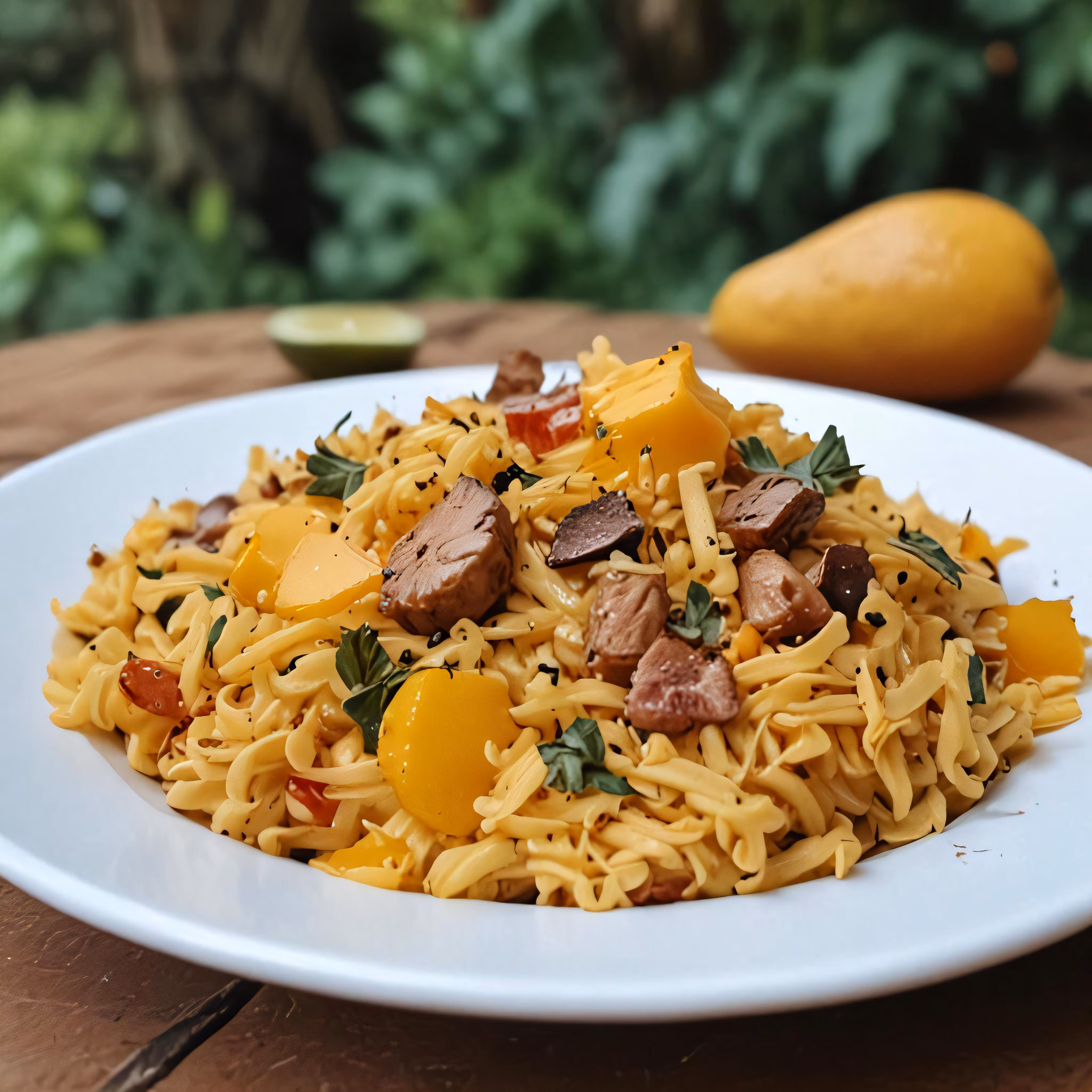 High resolution picture, free to use, the official logo for the 50 /a plate of meat, rice and vegetable pasta sits on a table outside