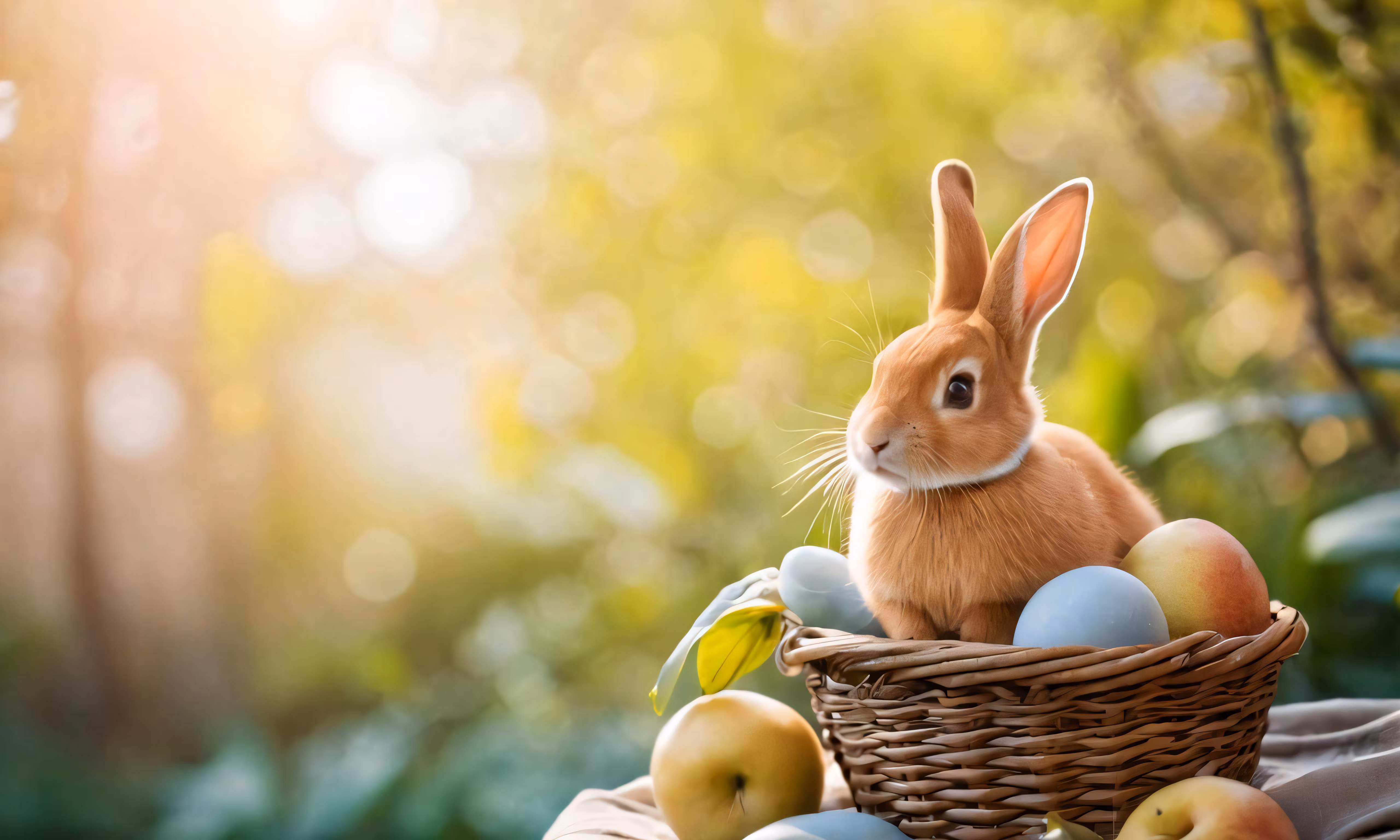 High resolution picture, free to use, the official logo for the 50 /a small rabbit sitting in a basket with some blue and green apples