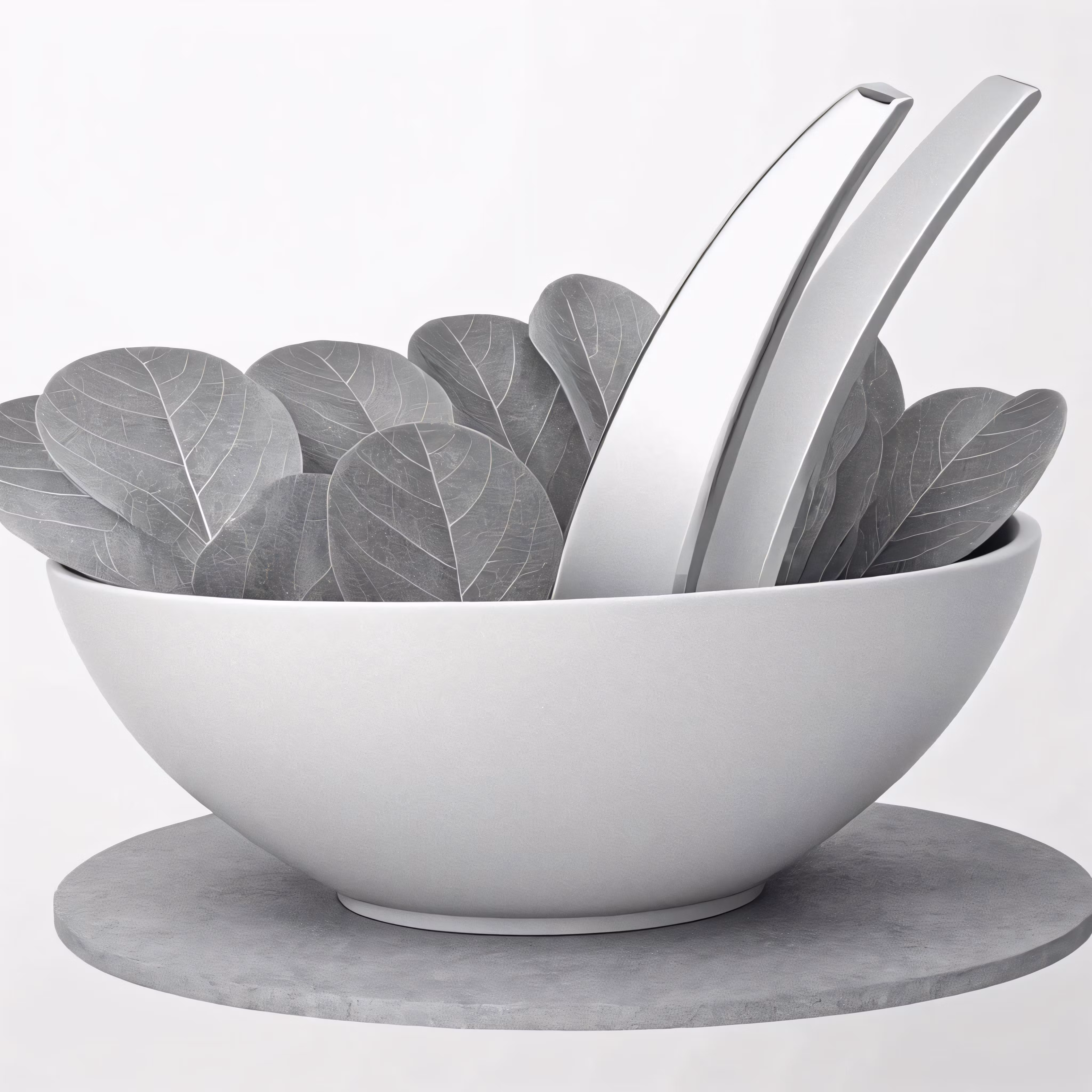 High resolution picture, free to use, the official logo for the 50 /a white bowl filled with metal leaf sculptures