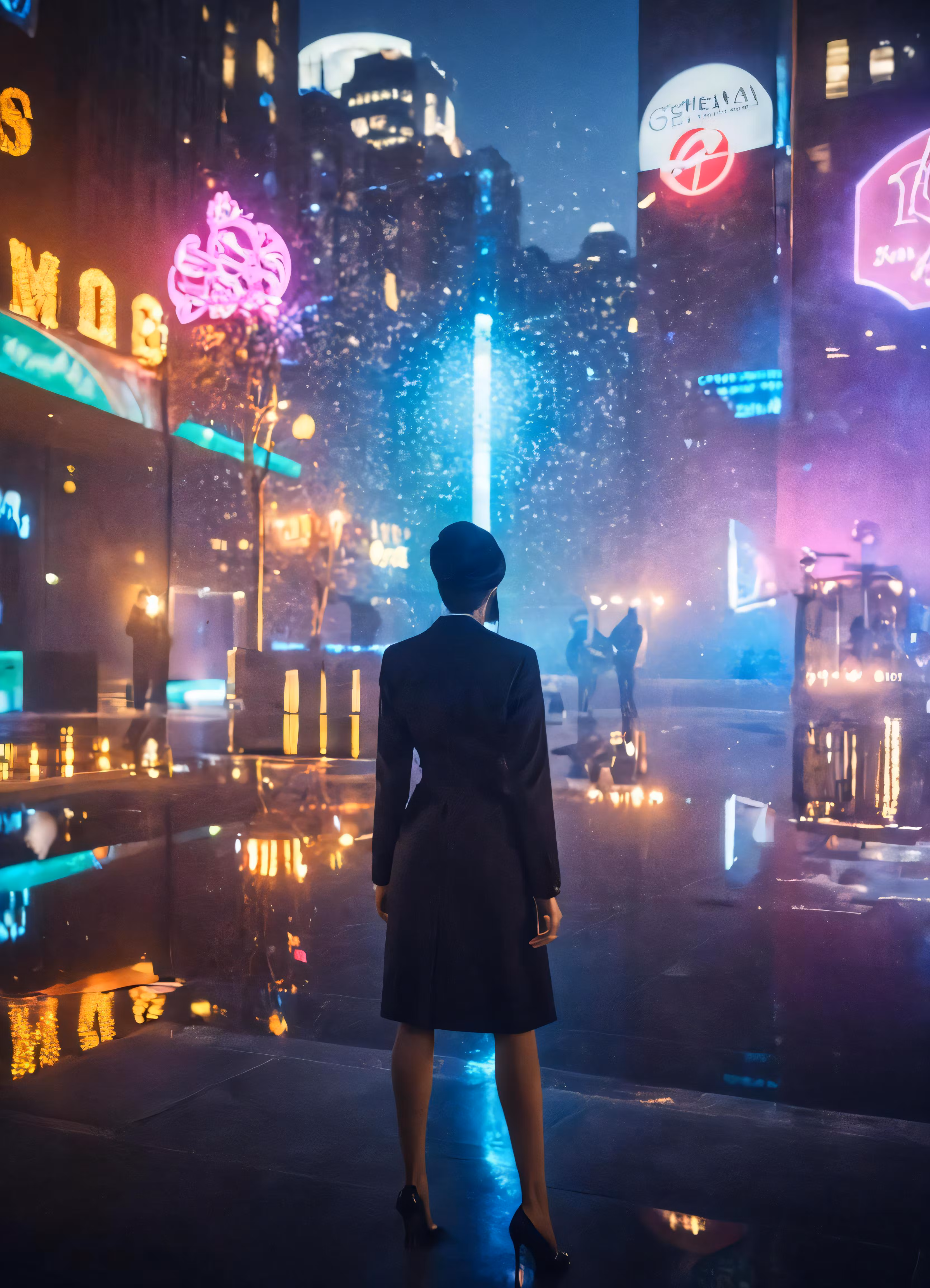 High resolution picture, free to use, the official logo for the 50 /a woman in a business suit looking at the neon lights