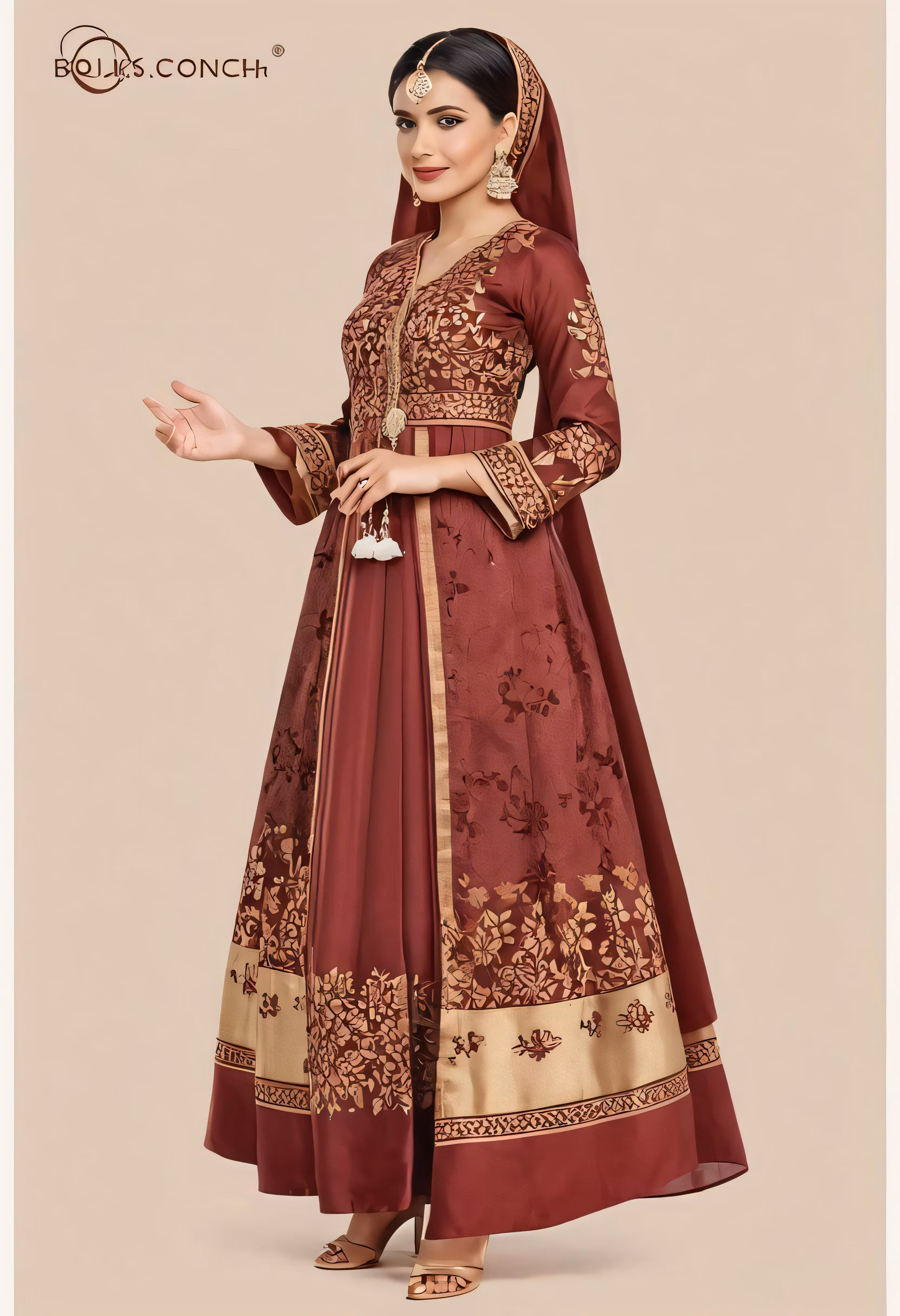 High resolution picture, free to use, the official logo for the 50 /a woman in a maroon gown and beige hat