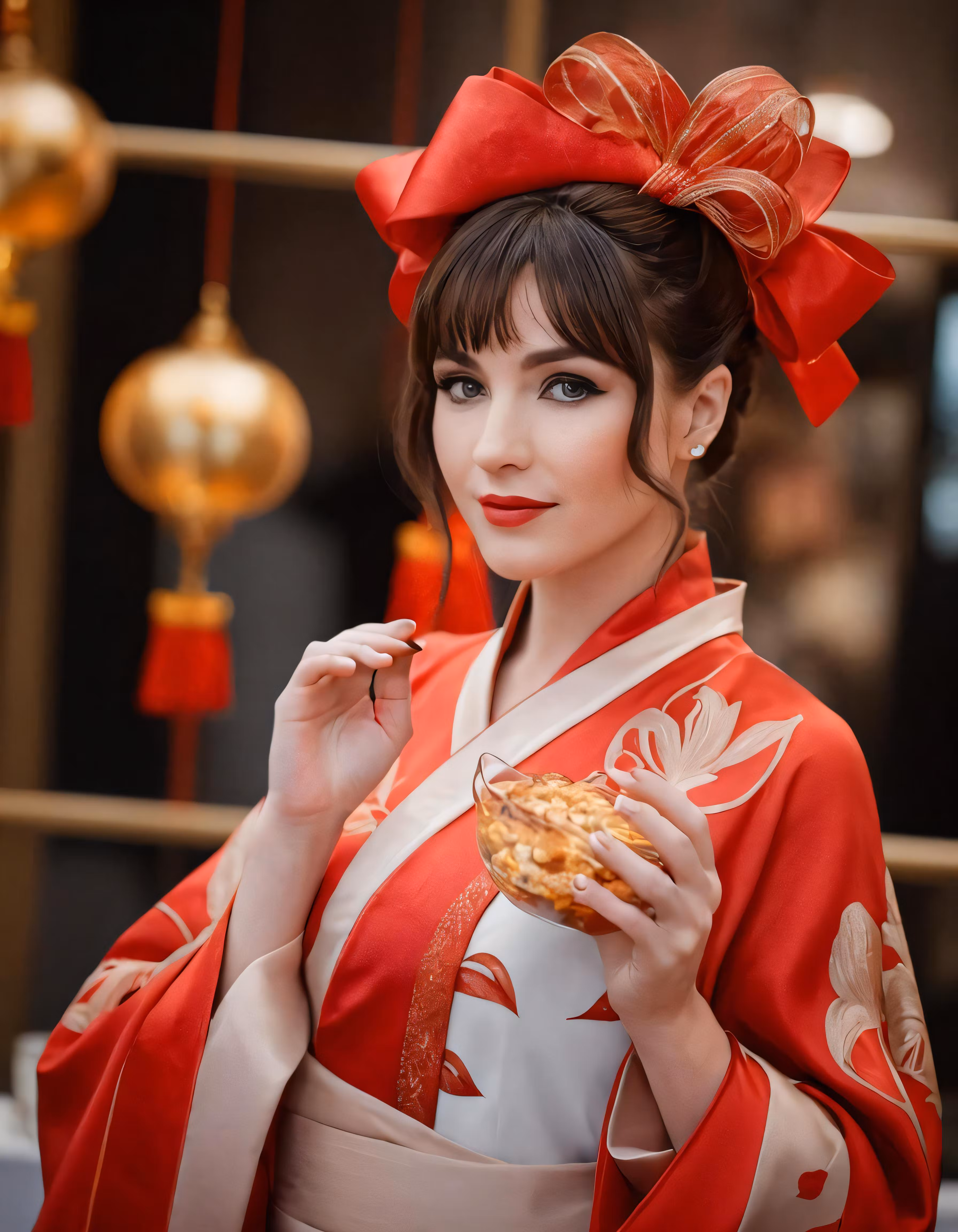 High resolution picture, free to use, the official logo for the 50 /a woman in an asian outfit and holding a pastry