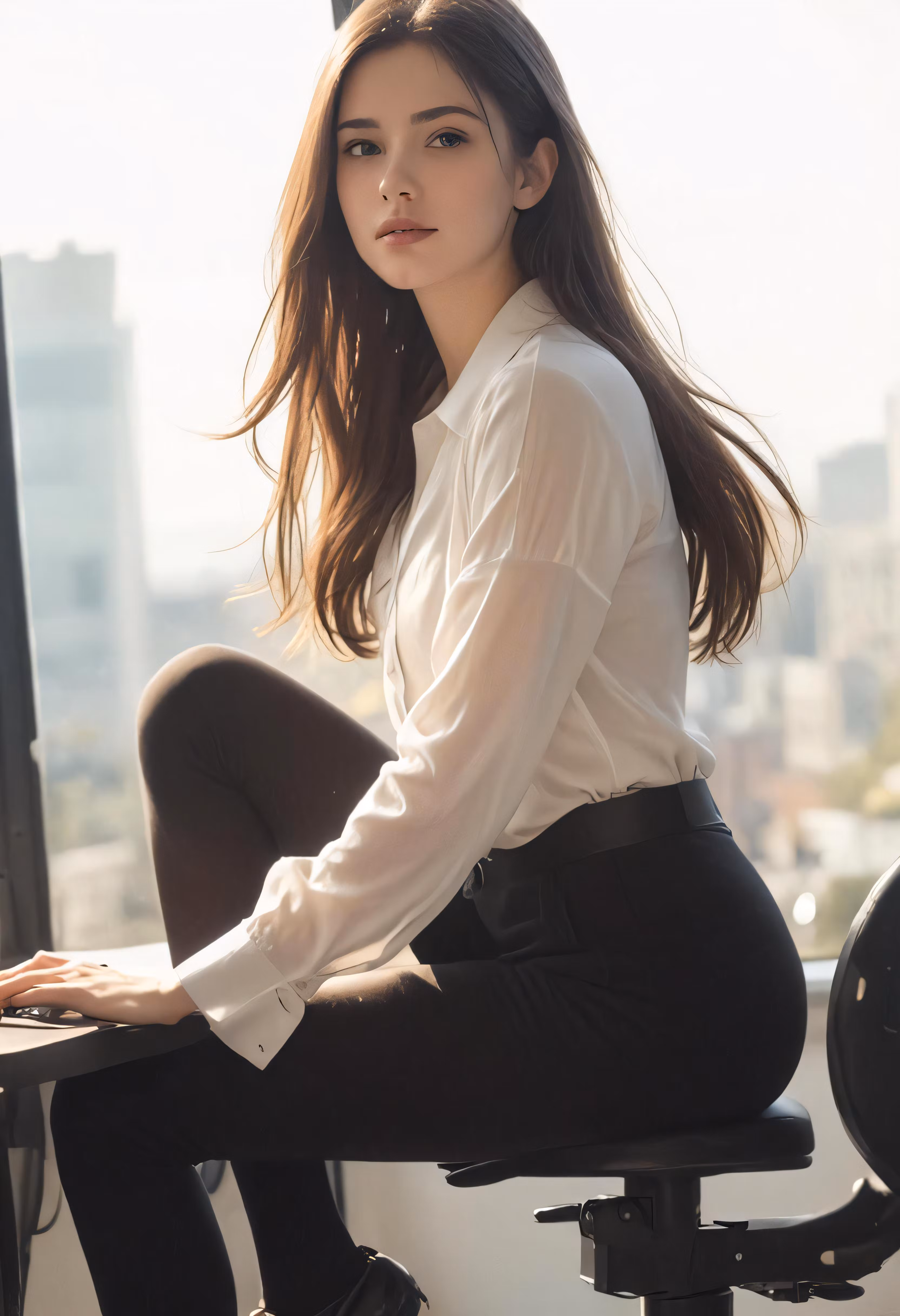 High resolution picture, free to use, the official logo for the 50 /a woman in black leggings is sitting on a chair and typing