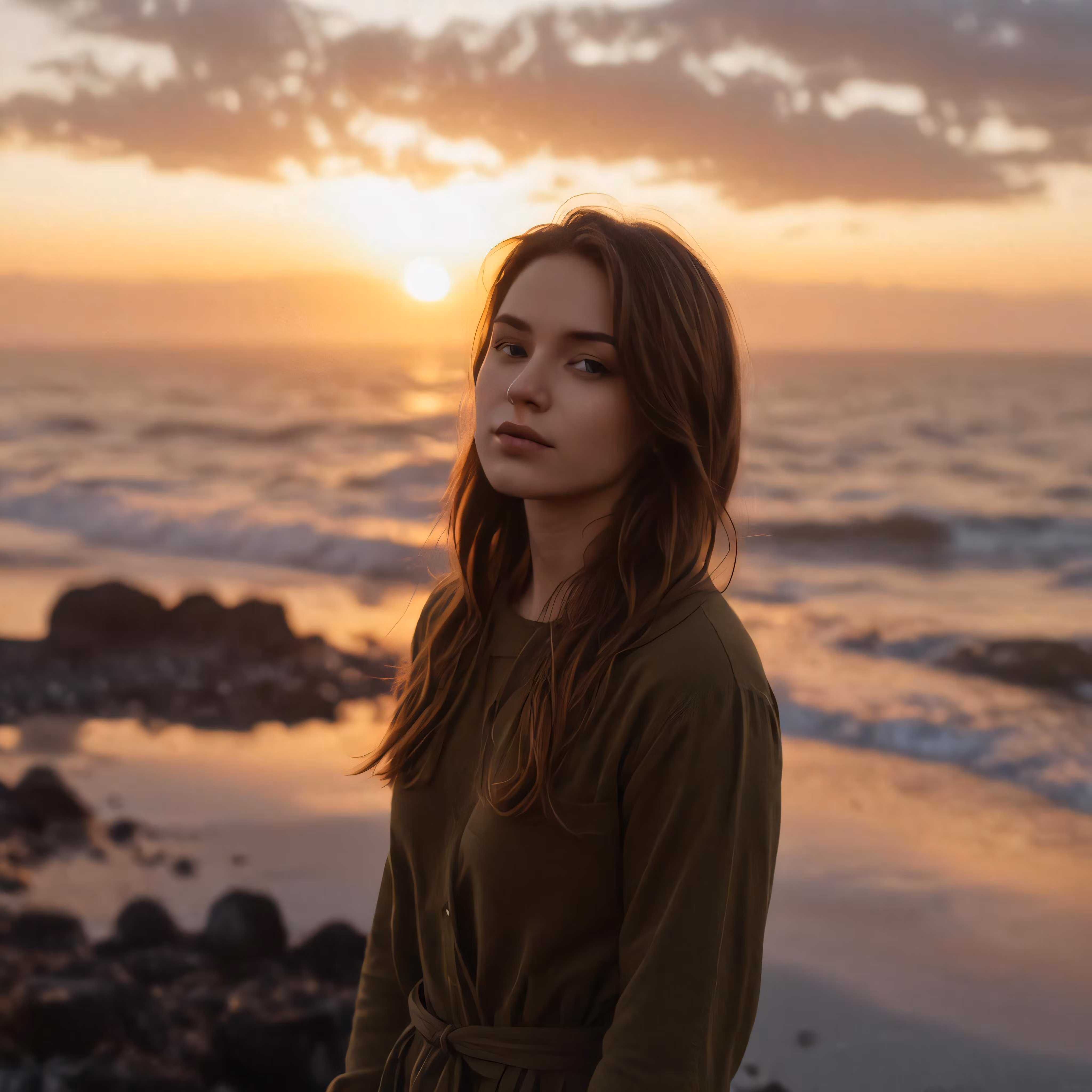 High resolution picture, free to use, the official logo for the 50 /a woman in green shirt standing on beach at sunset