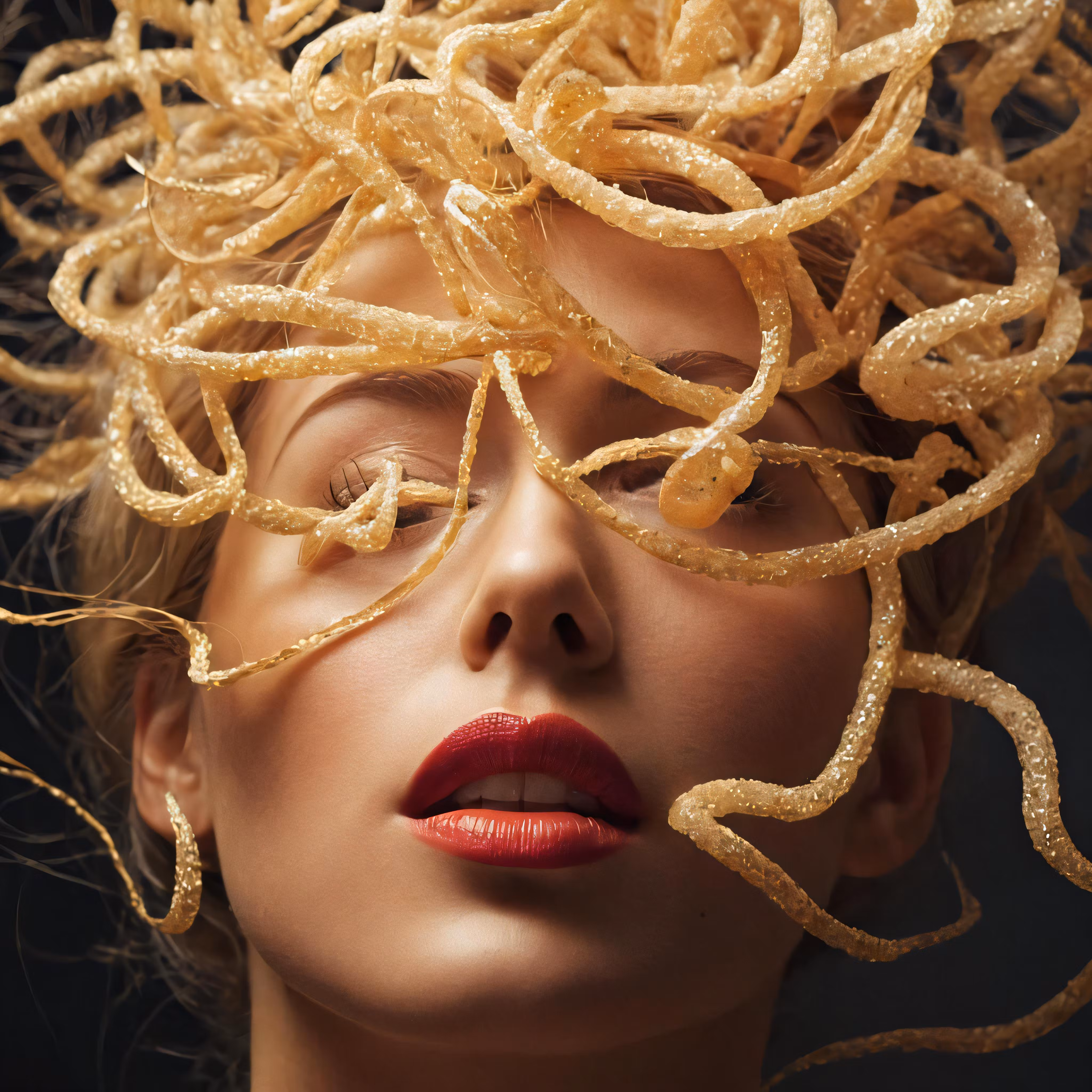 High resolution picture, free to use, the official logo for the 50 /a woman is covered with long, thin hair
