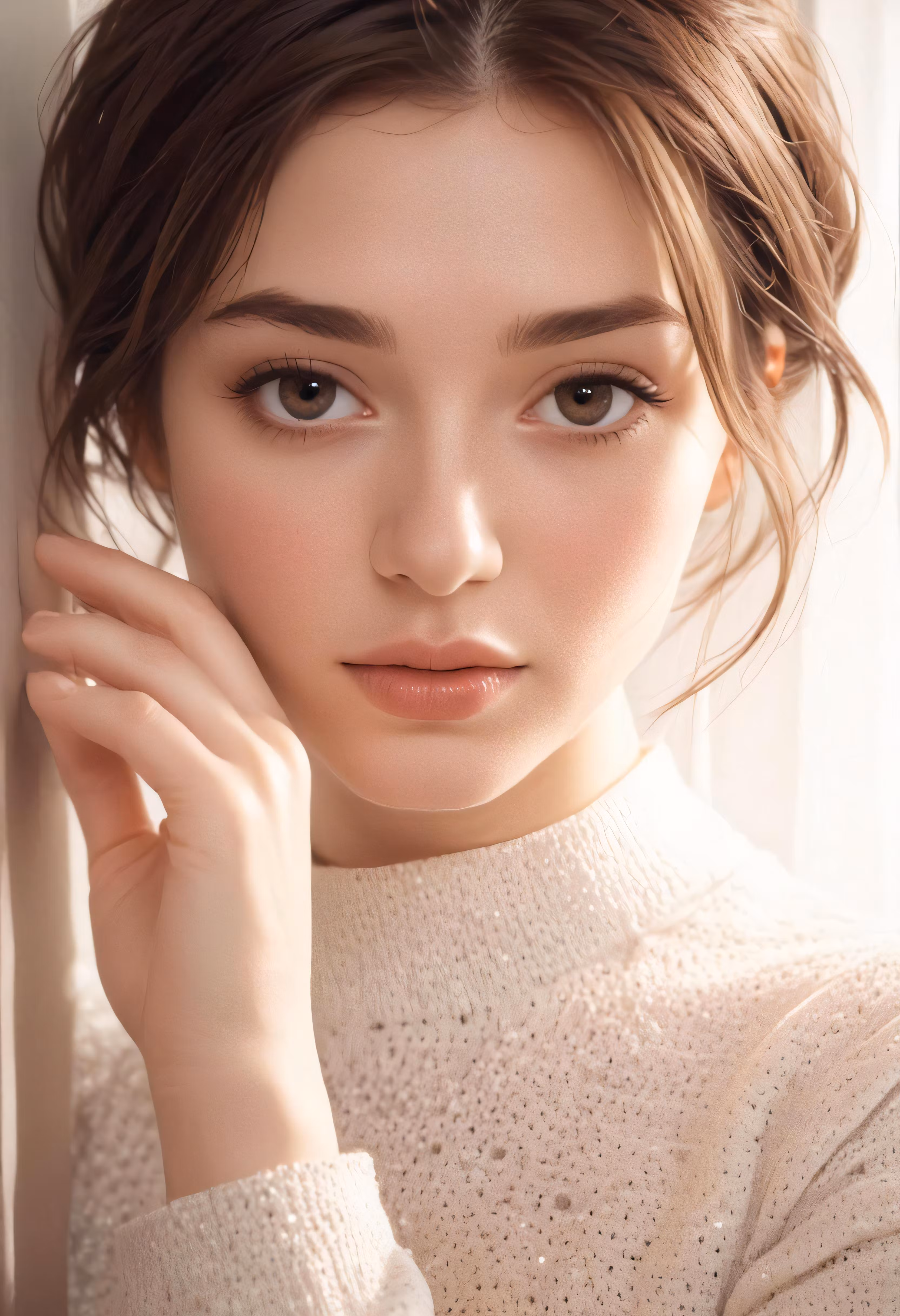 High resolution picture, free to use, the official logo for the 50 /a woman is posing near a window and her eyes are very large