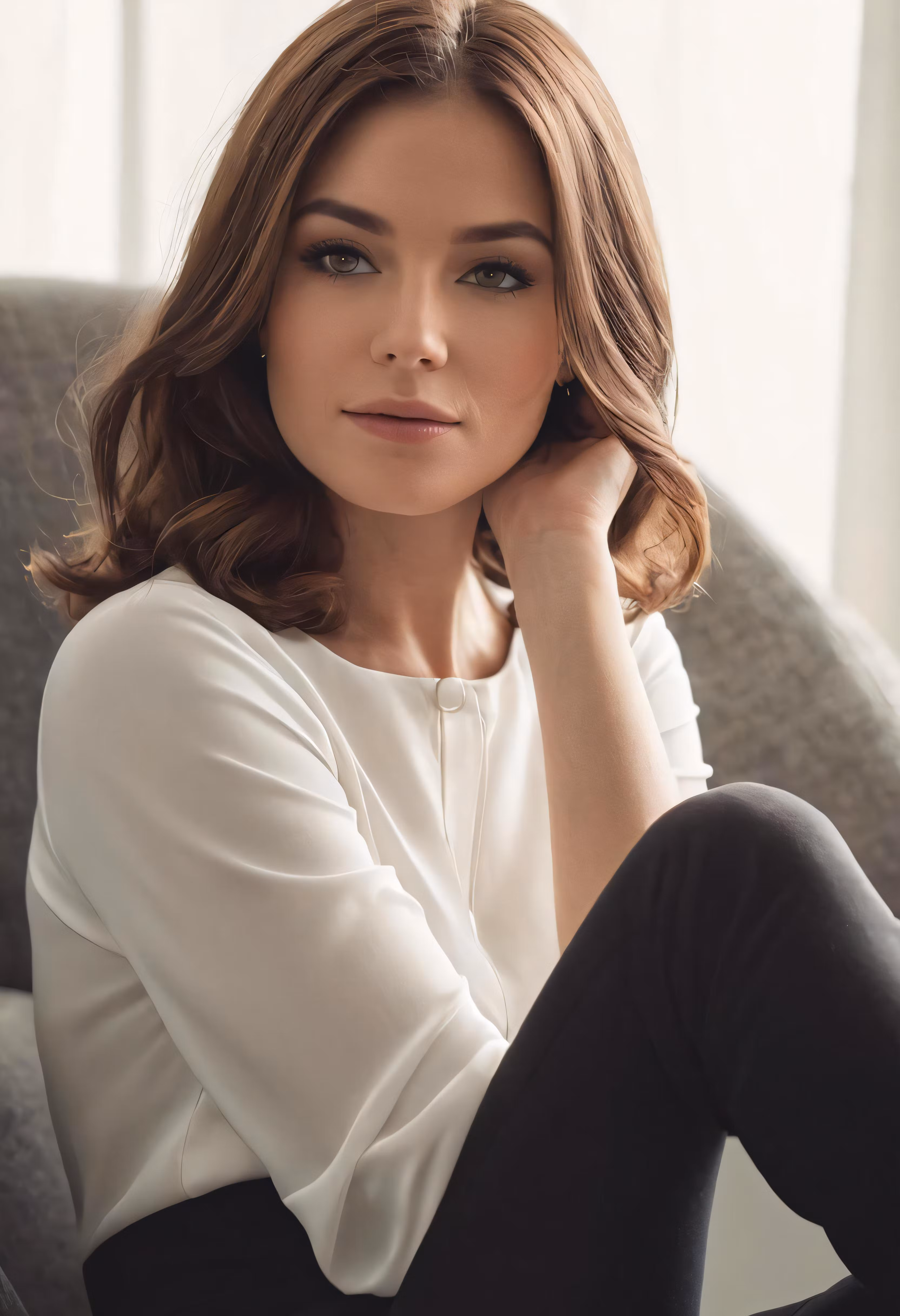 High resolution picture, free to use, the official logo for the 50 /a woman is sitting on the couch with her hands to her chin and her legs on her lap