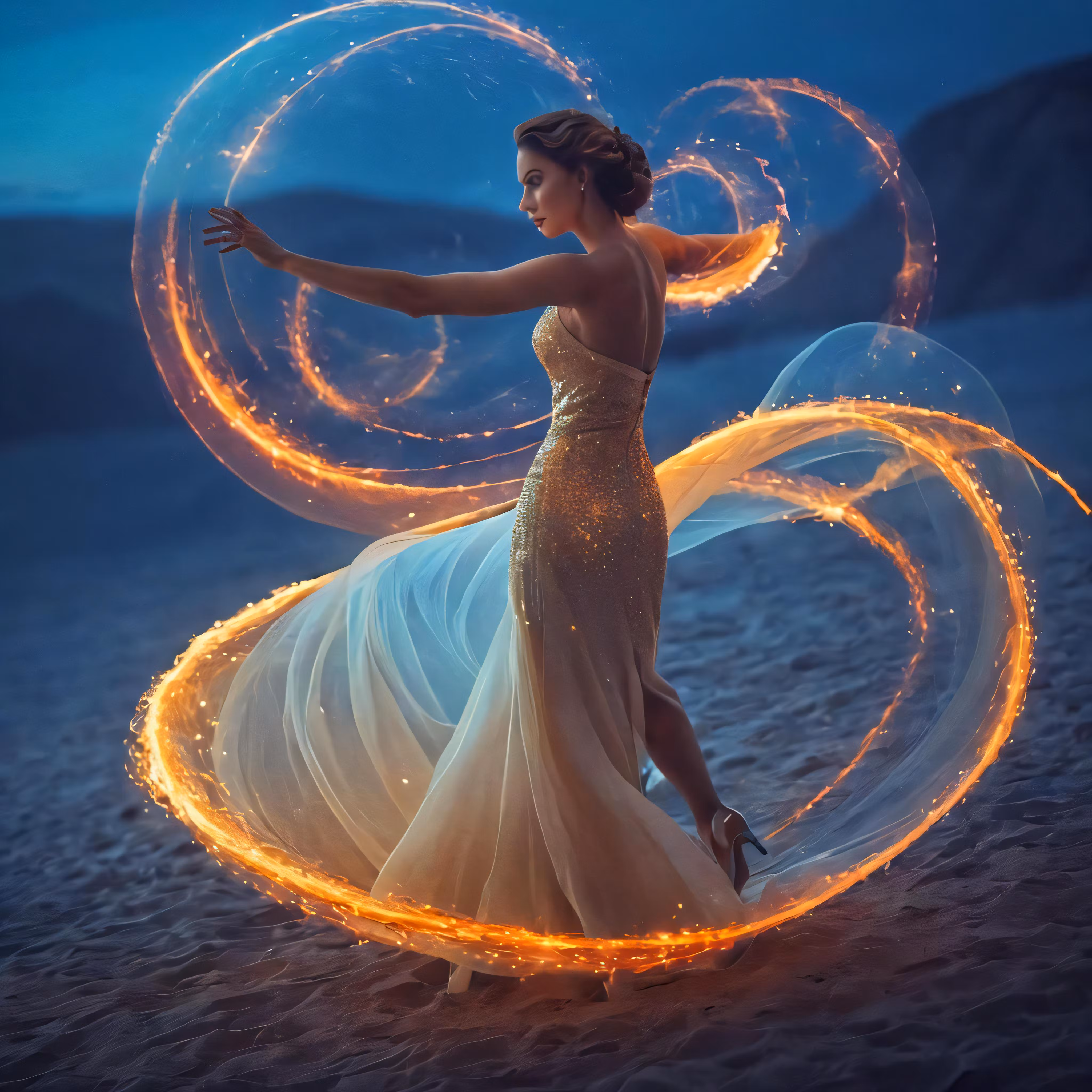 High resolution picture, free to use, the official logo for the 50 /a woman is wearing an elegant dress while spinning fire   swirling circles