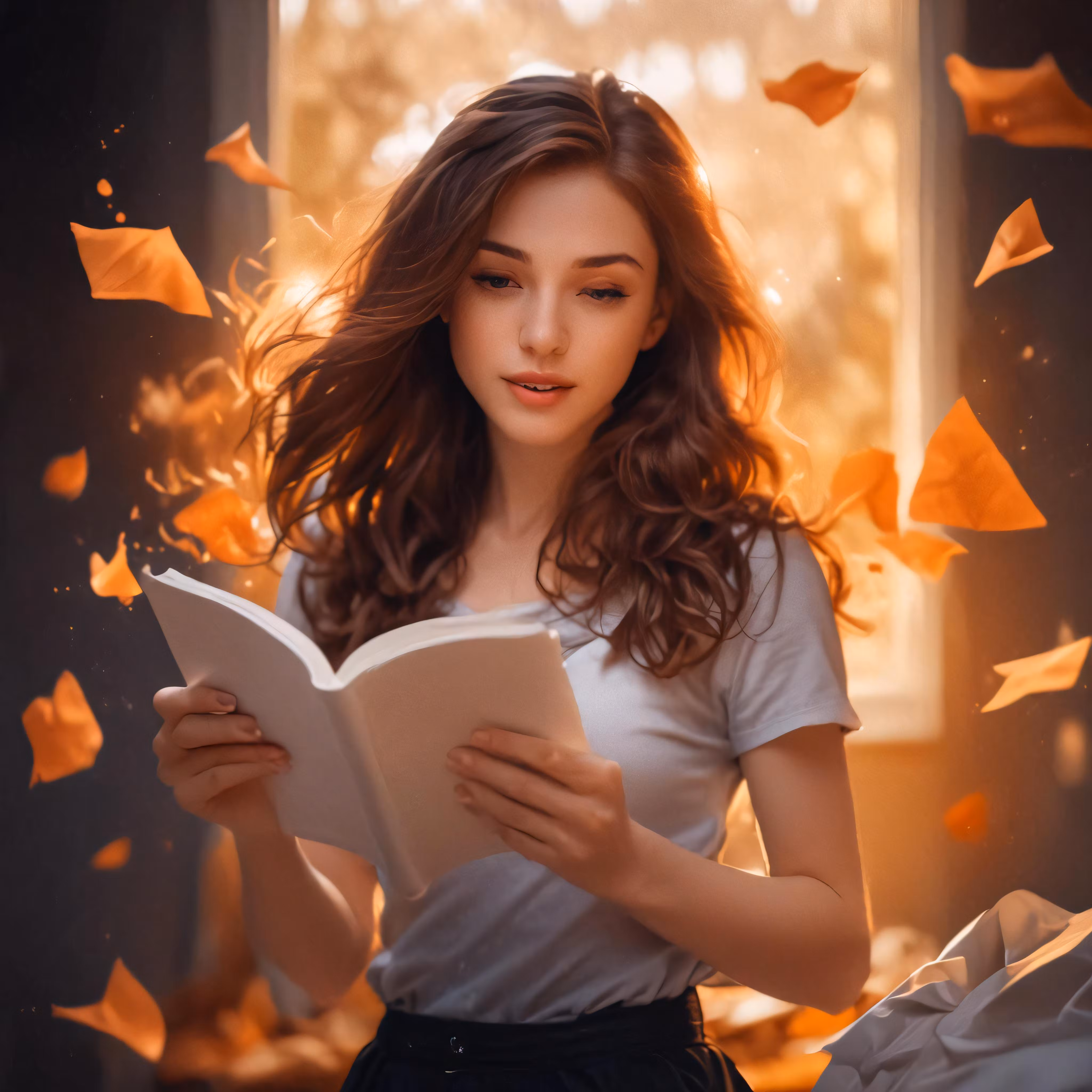 High resolution picture, free to use, the official logo for the 50 /a woman reading a book on her bed with orange paper flying around her