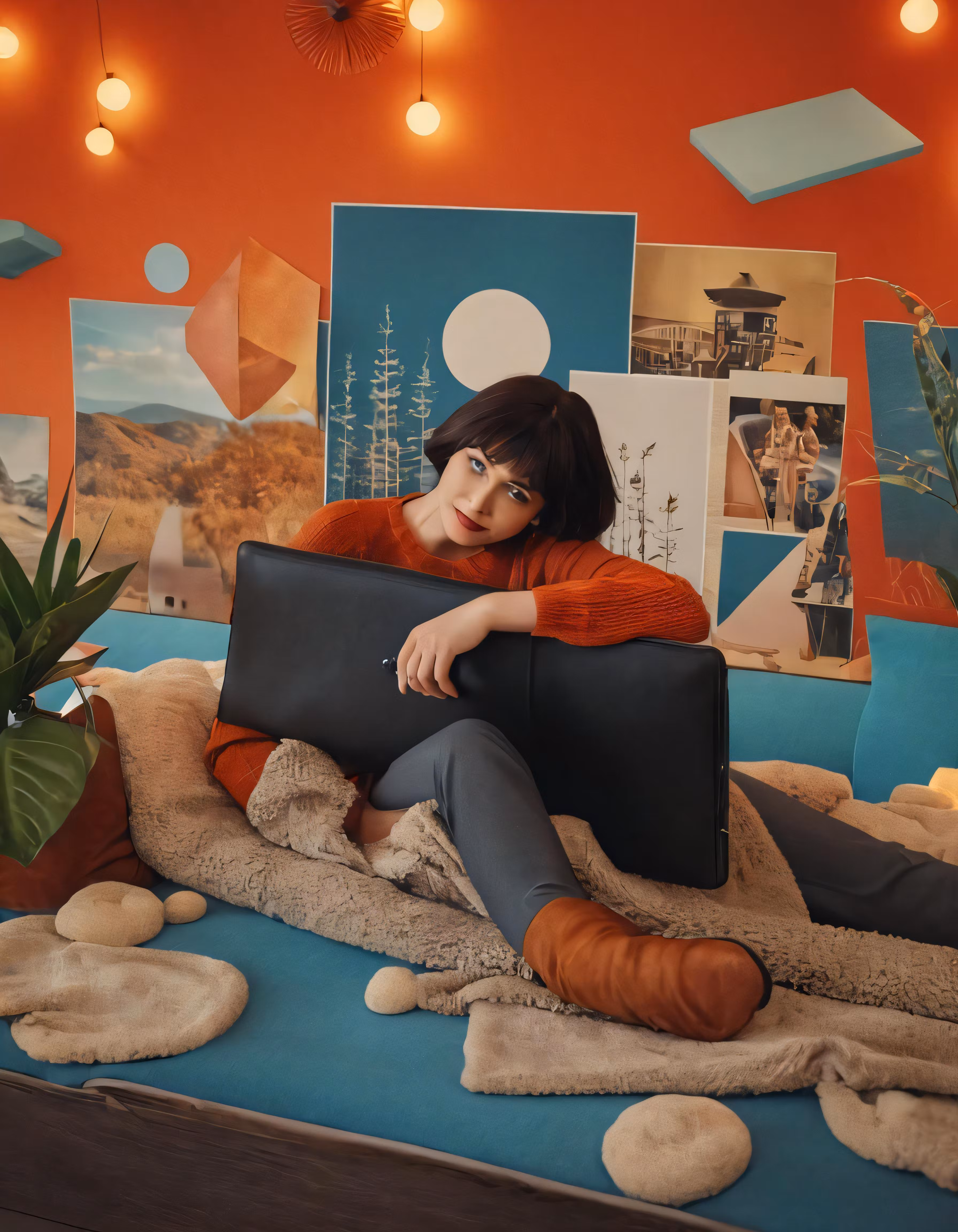 High resolution picture, free to use, the official logo for the 50 /a woman sitting on a bed on top of a laptop
