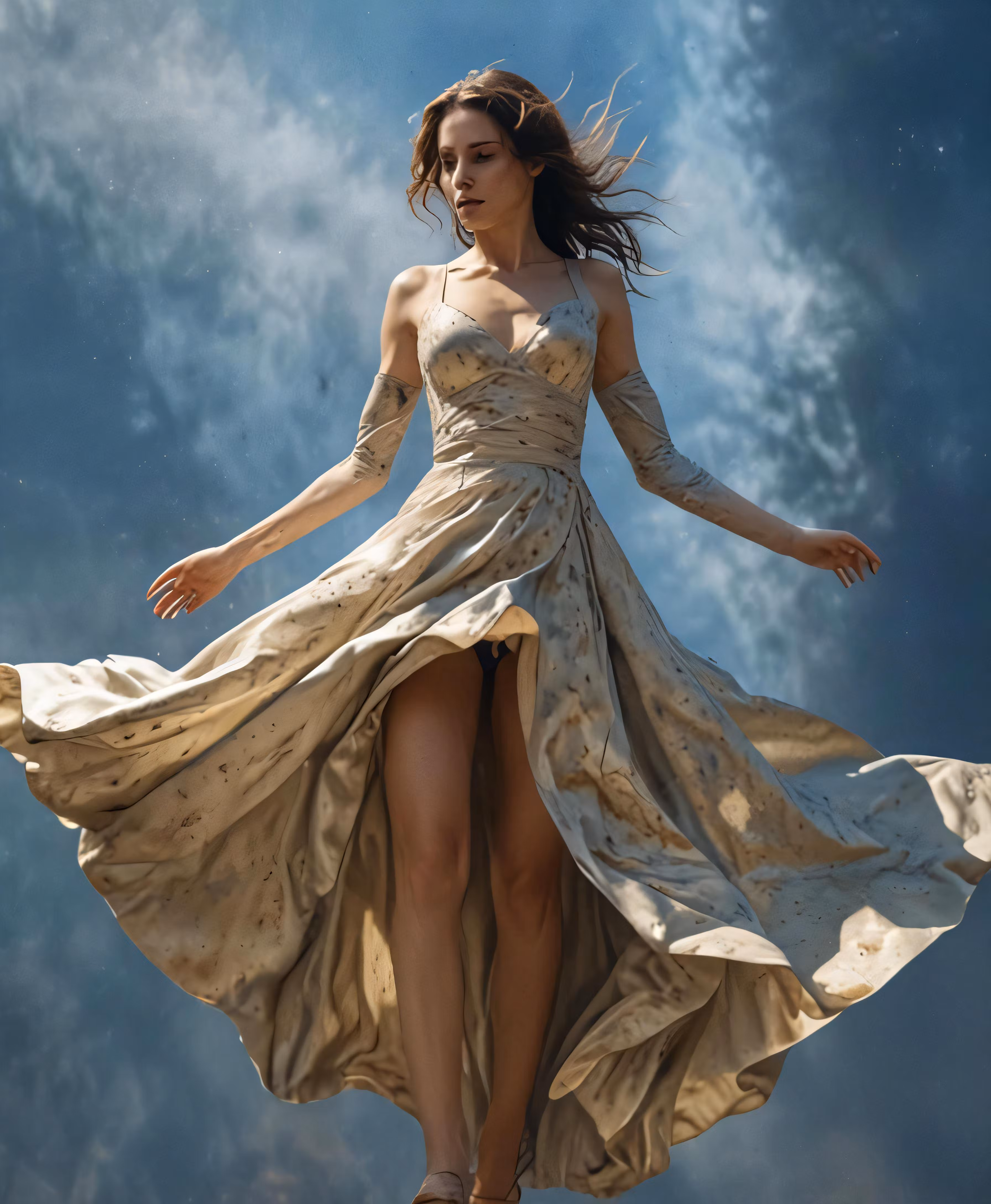 High resolution picture, free to use, the official logo for the 50 /a woman wearing a long beige dress