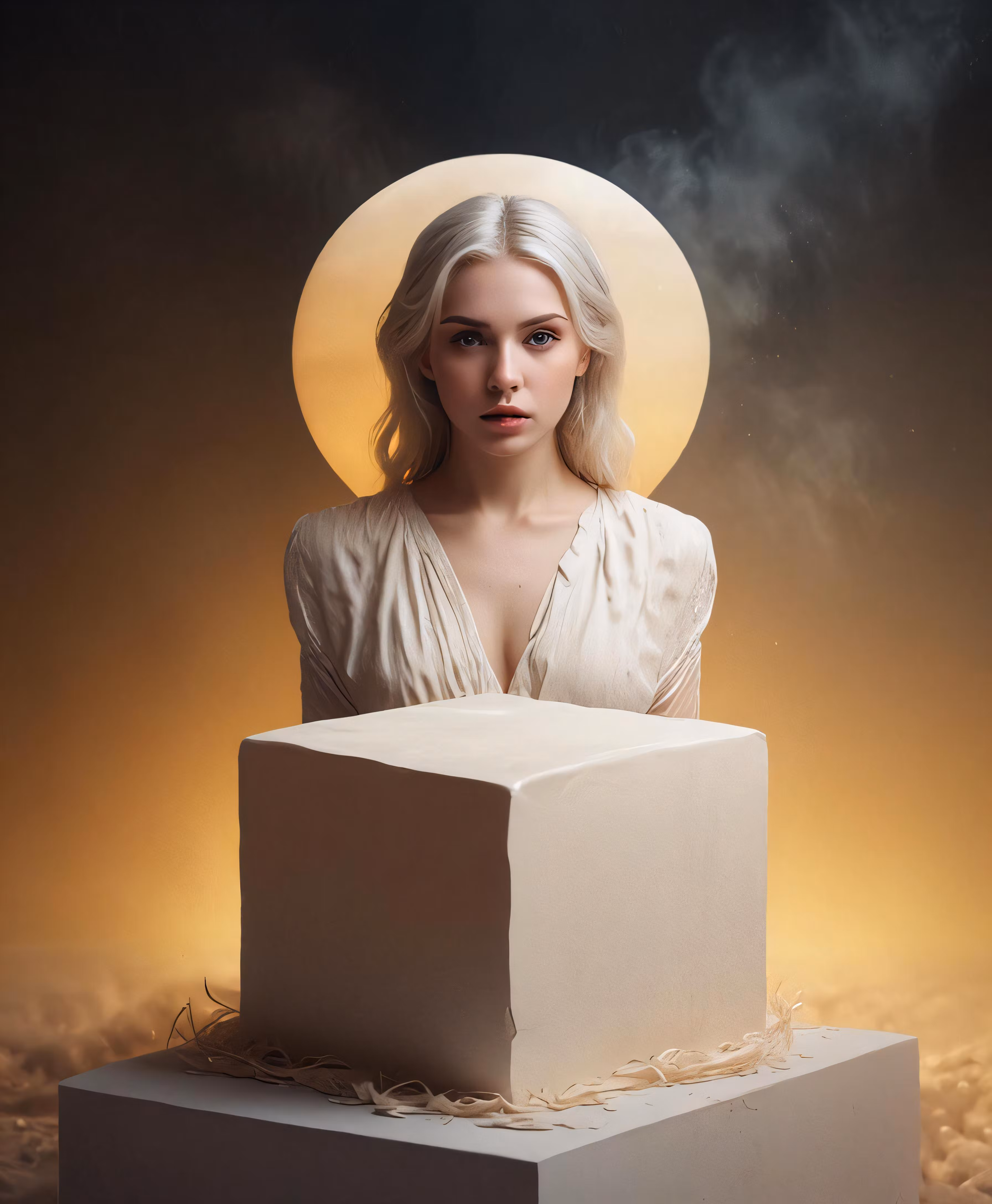 High resolution picture, free to use, the official logo for the 50 /a woman with blonde hair is sitting behind a statue