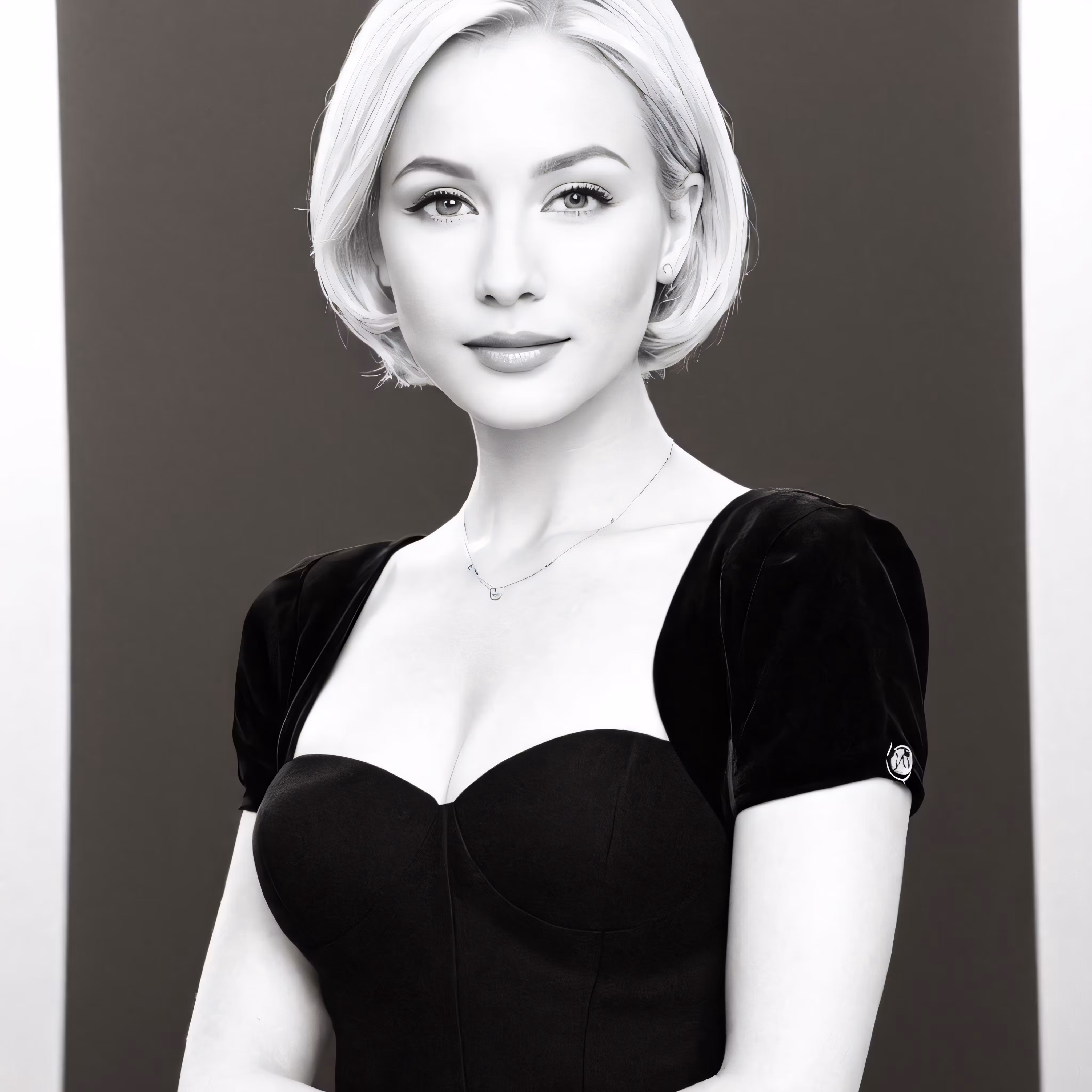 High resolution picture, free to use, the official logo for the 50 /a woman with blonde hair wearing a black dress
