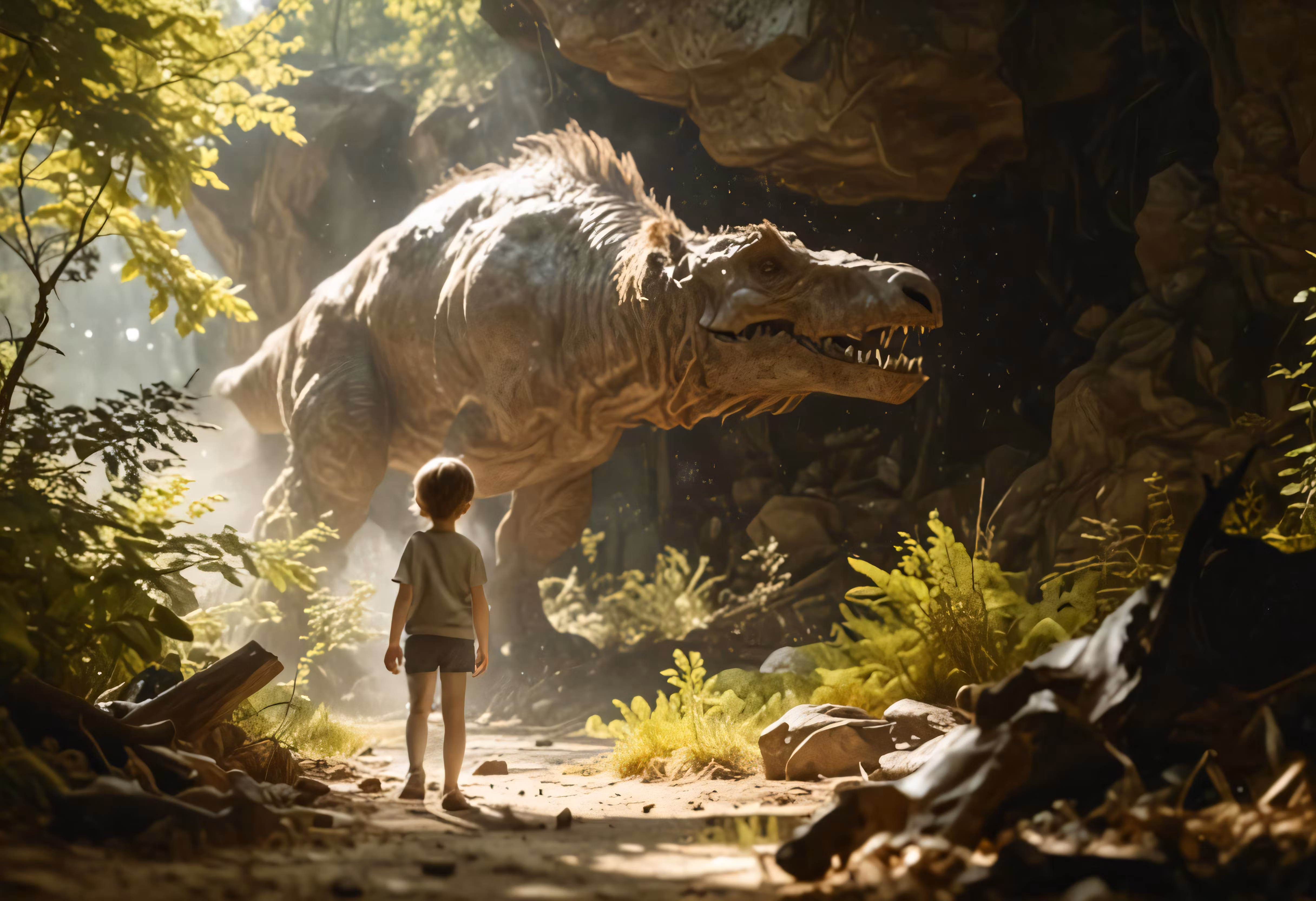 High resolution picture, free to use, the official logo for the 50 /a young child watching a dinosaur in the background