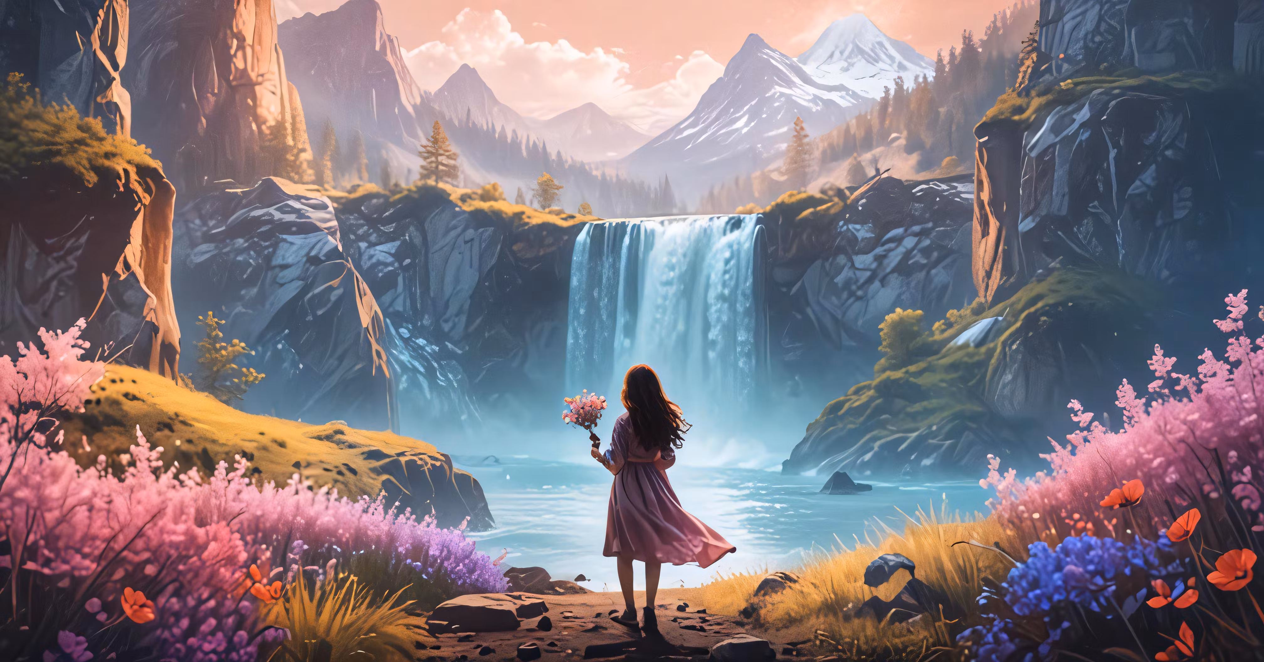High resolution picture, free to use, the official logo for the 50 /a young girl in a dress standing at the edge of a waterfall