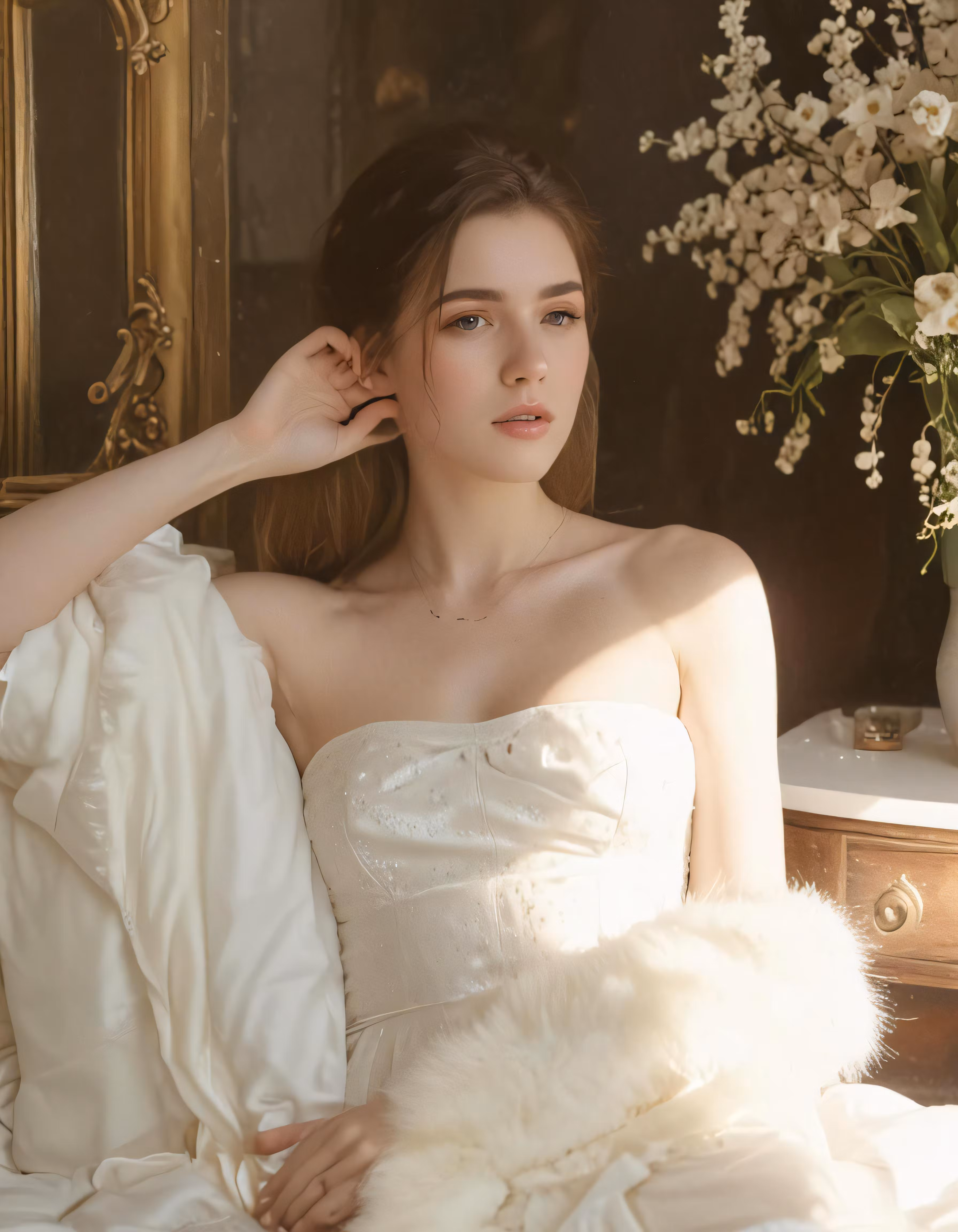 High resolution picture, free to use, the official logo for the 50 /a young woman in an all white dress sitting on a bed