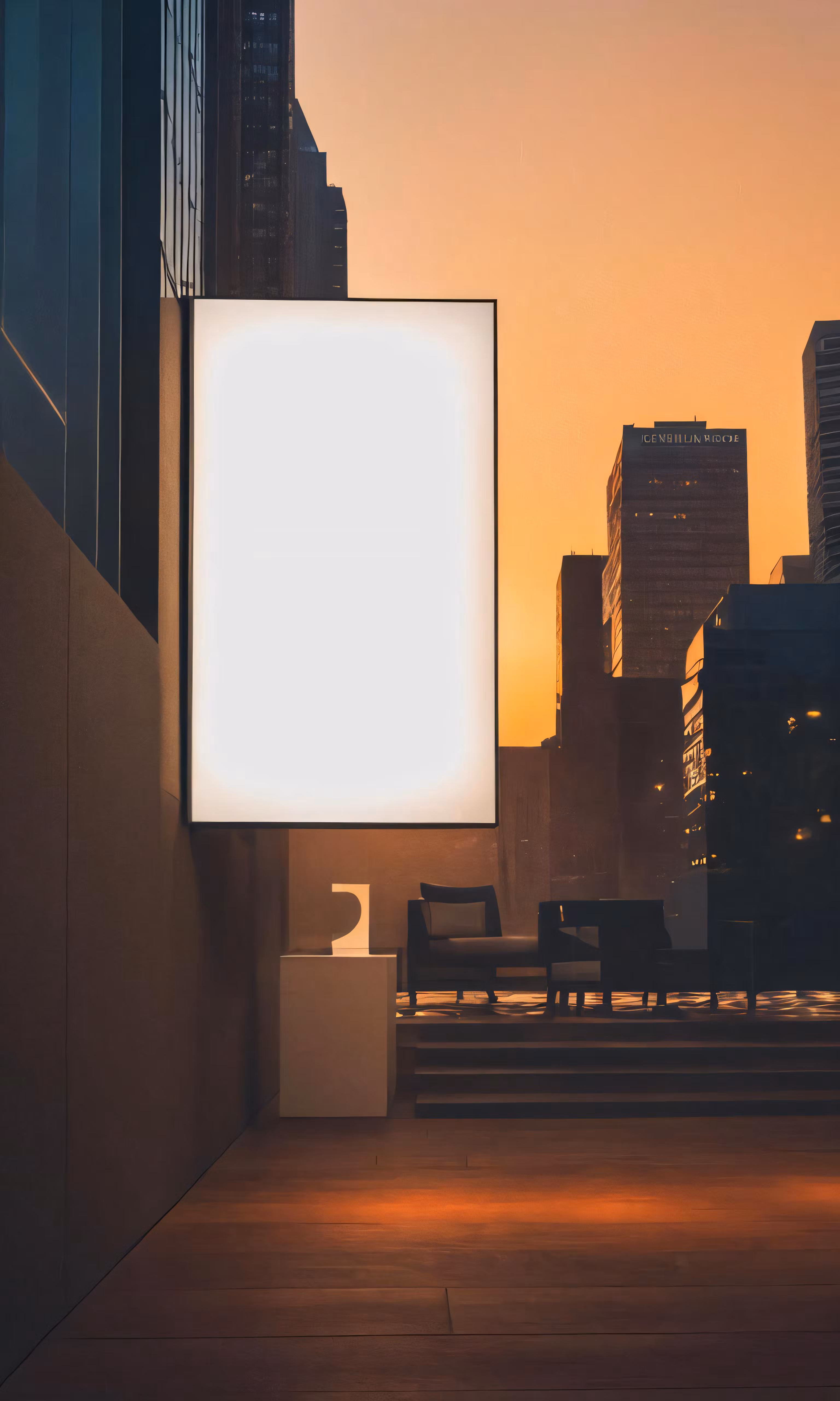 High resolution picture, free to use, the official logo for the 50 /an empty street sign stands next to a city at sunset