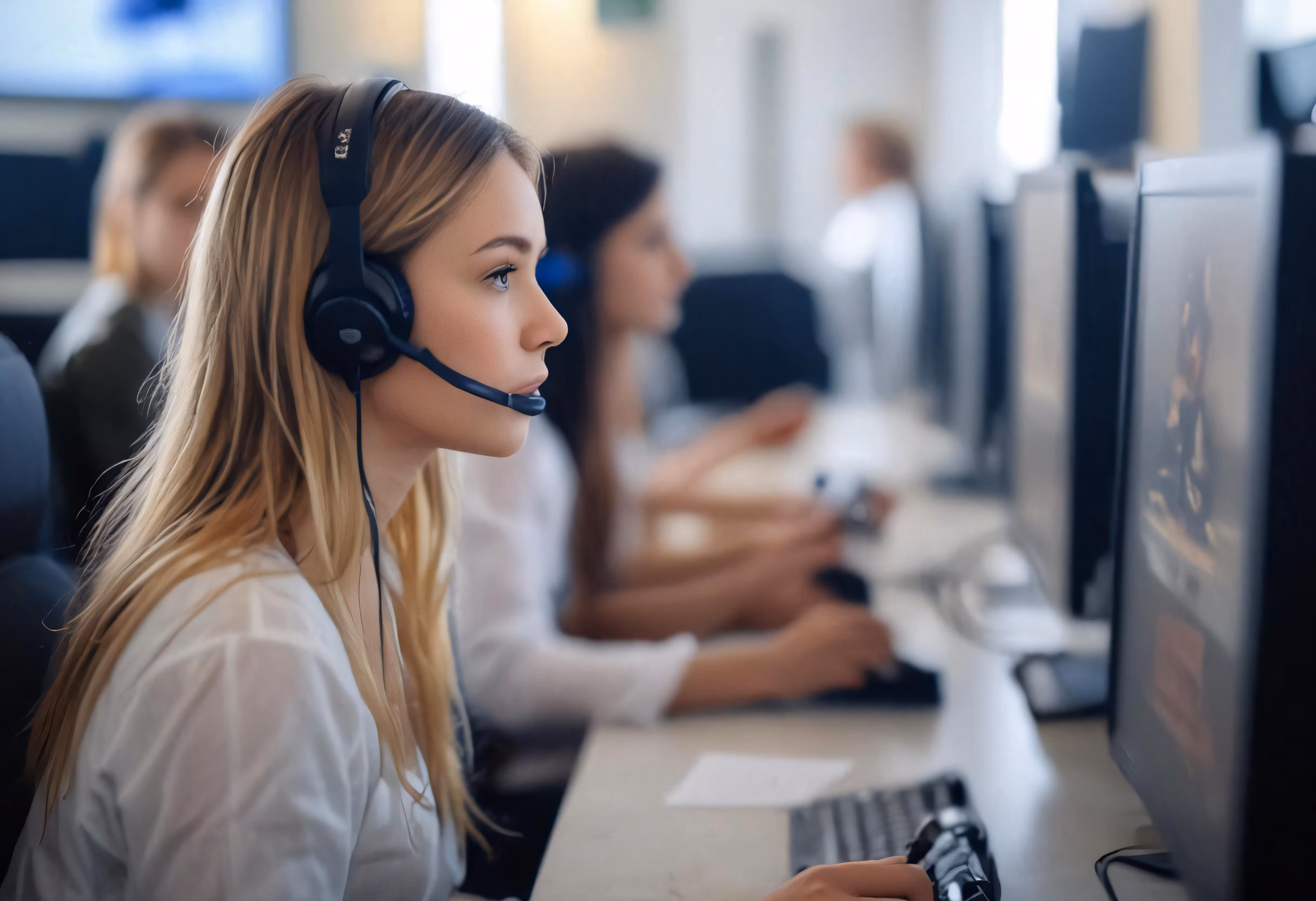 High resolution picture, free to use, the official logo for the 50 /an office call center worker with headphones and two monitors