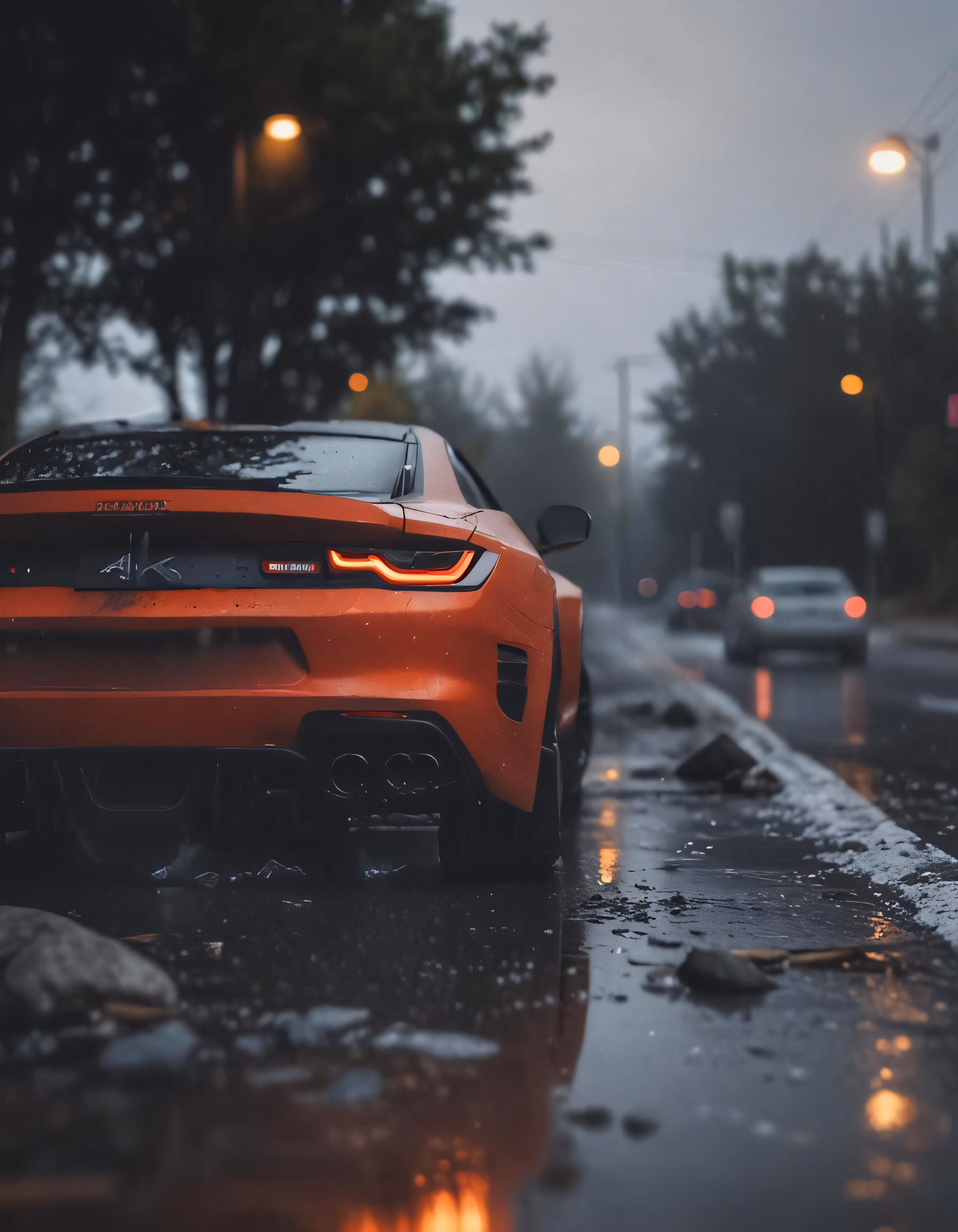 High resolution picture, free to use, the official logo for the 50 /an orange sports car sitting in the rain next to a brick wall