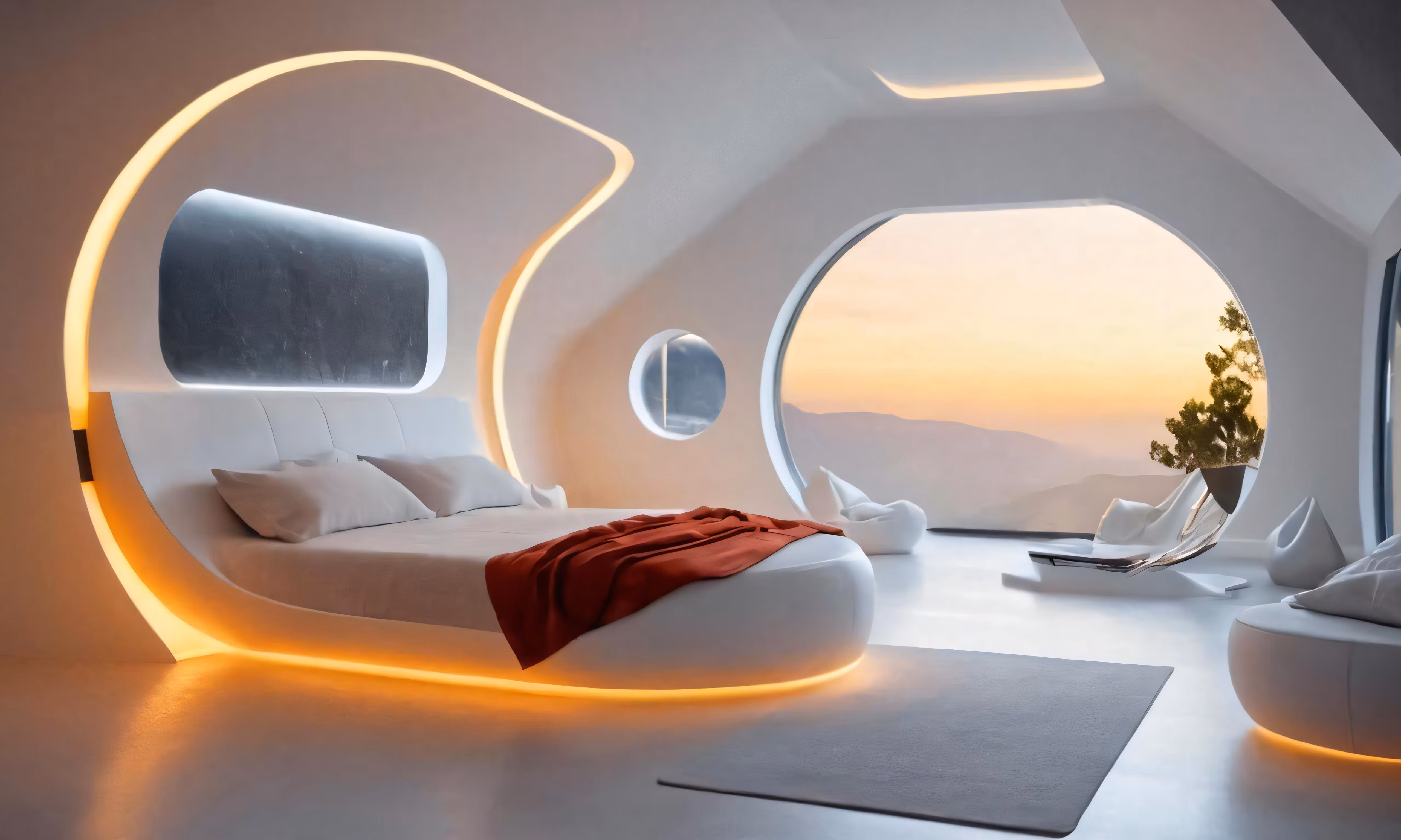 High resolution picture, free to use, the official logo for the 50 /bedroom with oval bed surrounded by round window