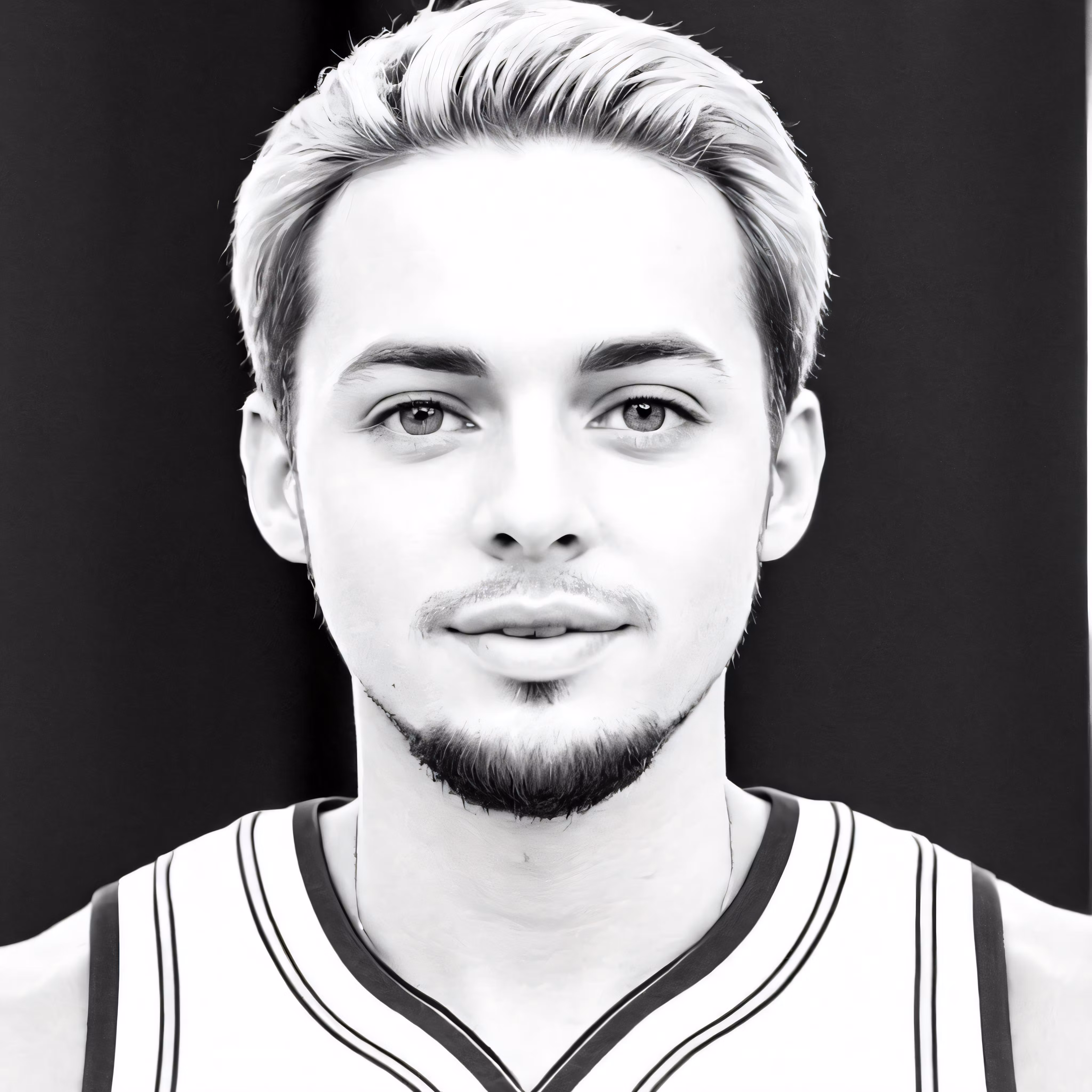 High resolution picture, free to use, the official logo for the 50 /black and white photograph of a young man with a beard
