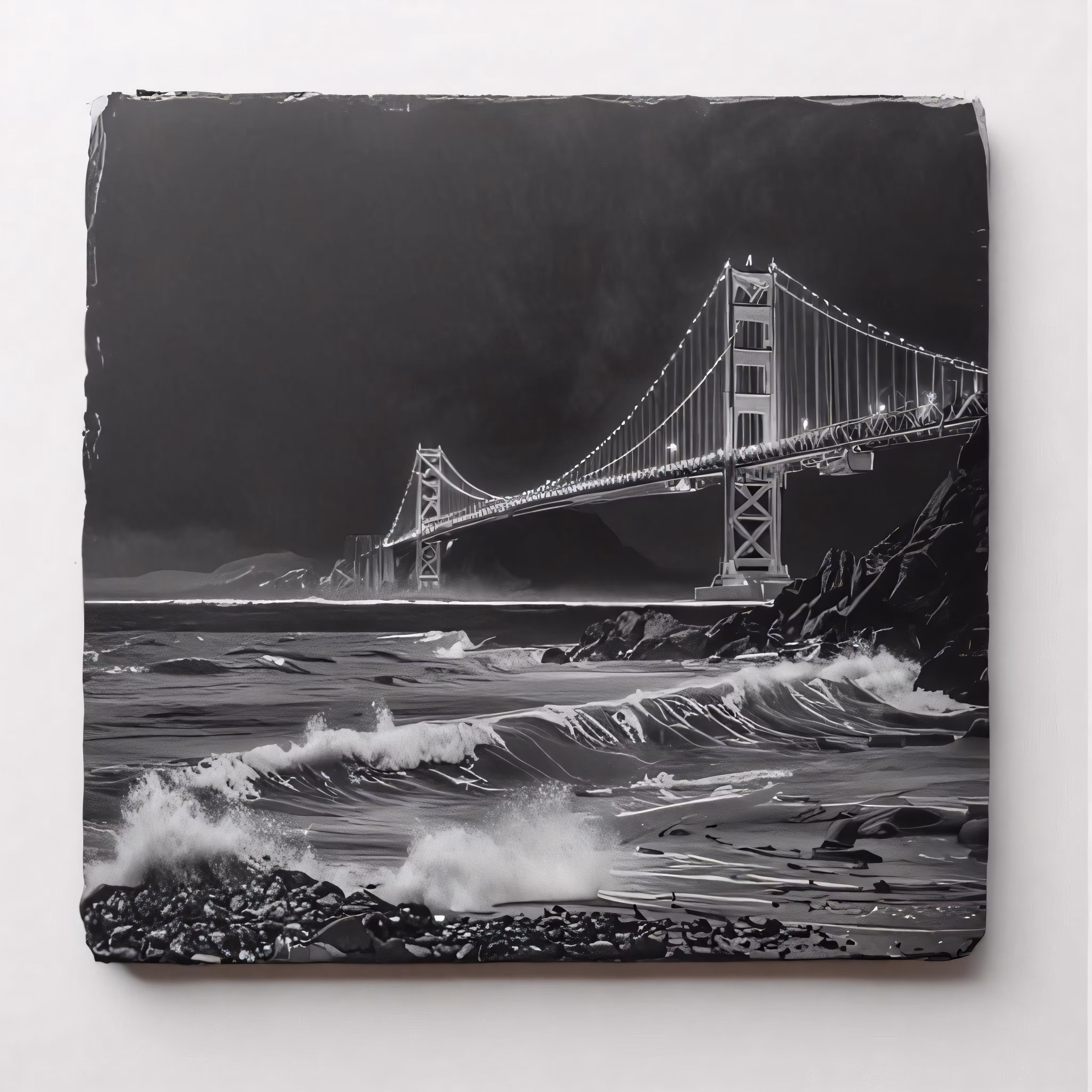 High resolution picture, free to use, the official logo for the 50 /black and white photograph of the golden gate bridge from a rocky shore