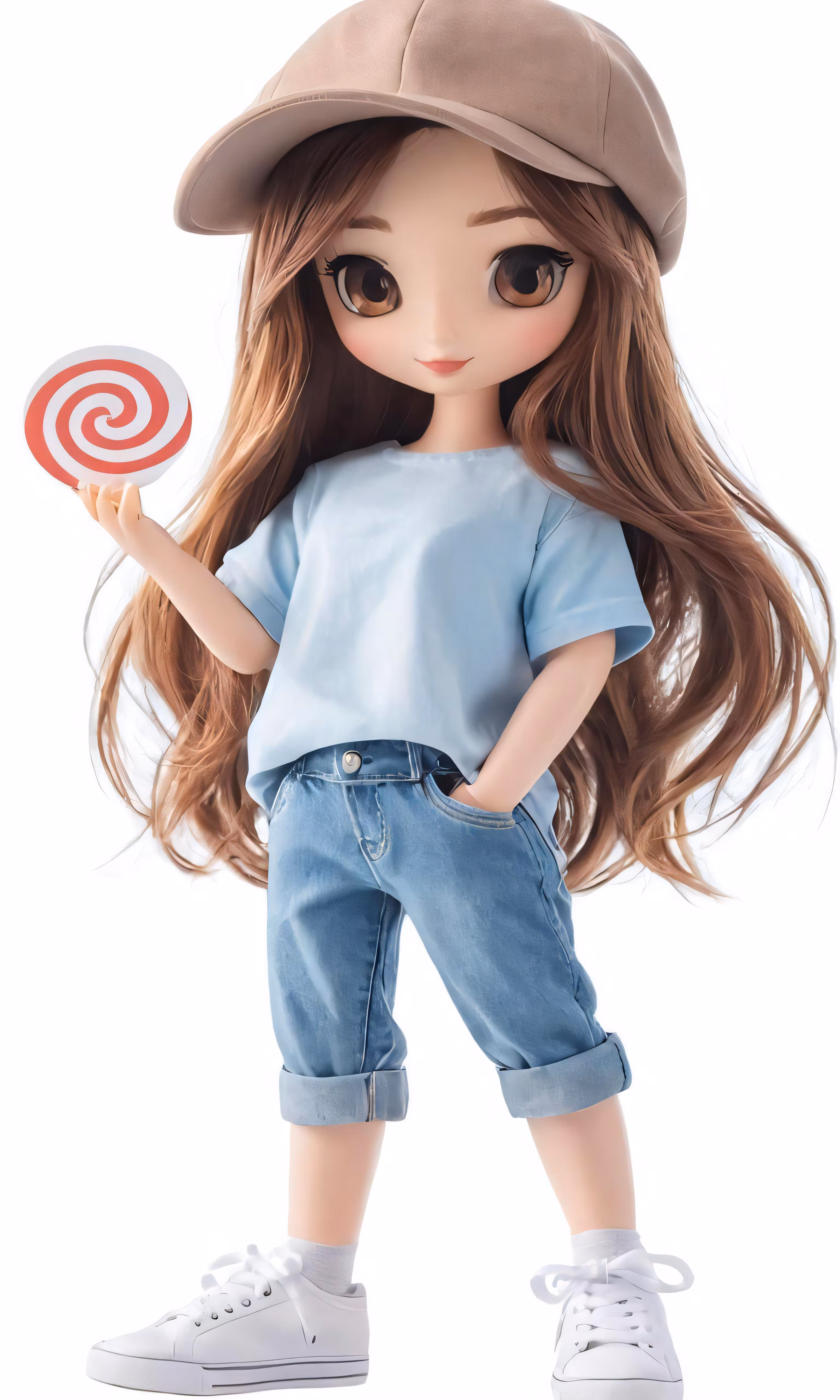 High resolution picture, free to use, the official logo for the 50 /doll holding a candy lollypop while posing for the camera