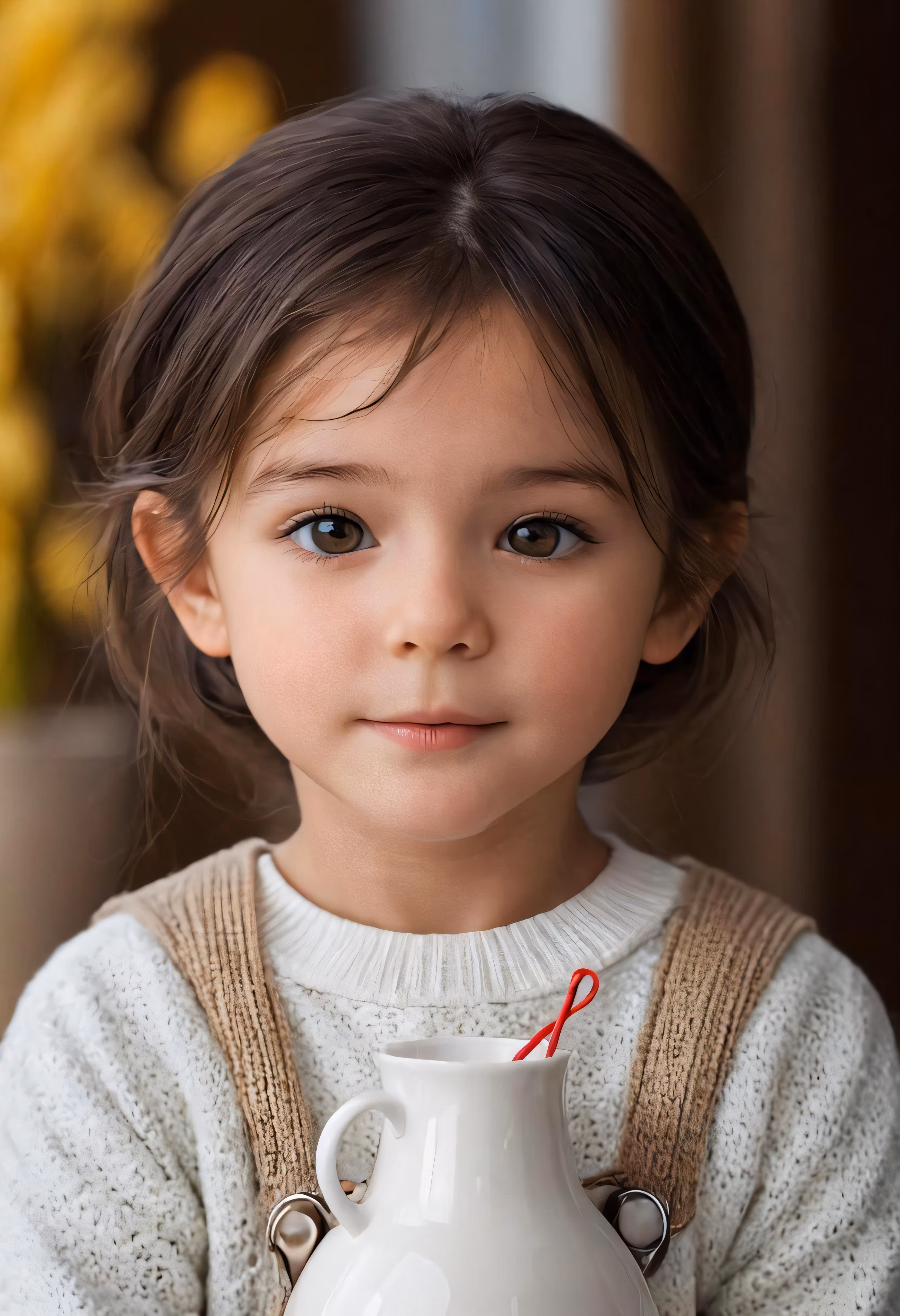 High resolution picture, free to use, the official logo for the 50 /little girl wearing white sweater and holding a white vase with red designs on the bottom
