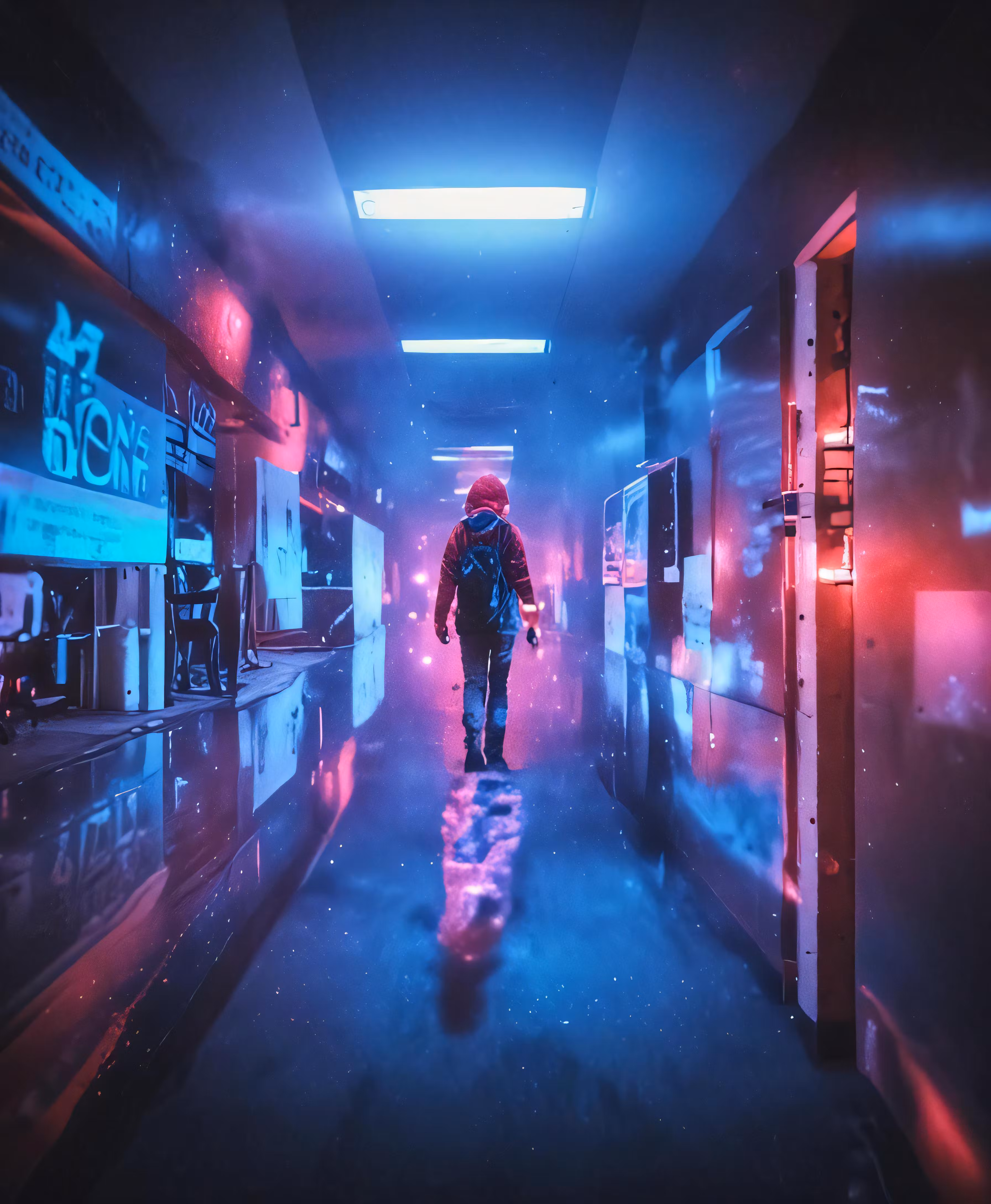 High resolution picture, free to use, the official logo for the 50 /man in dark hallway moving toward brightly lit lockers