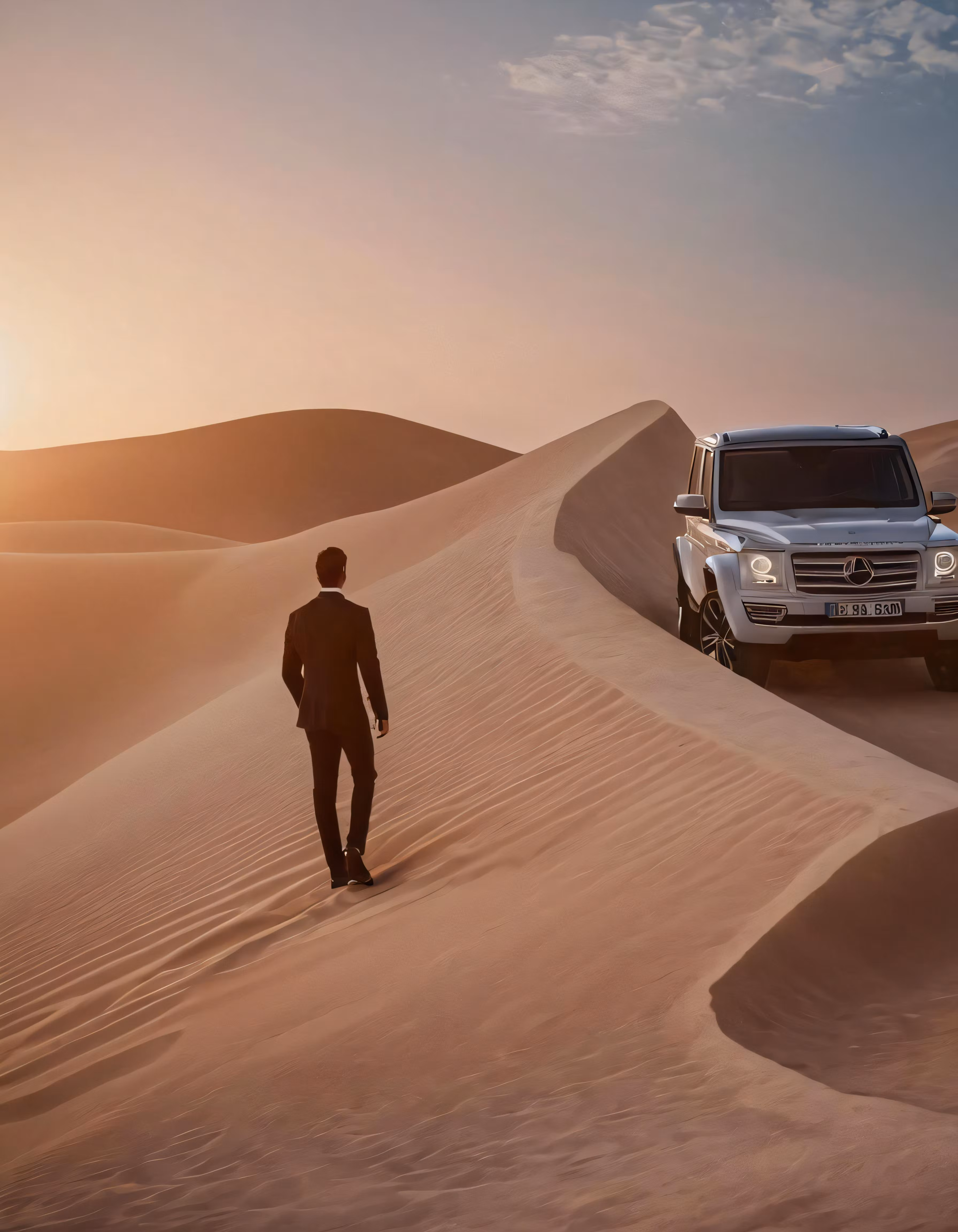 High resolution picture, free to use, the official logo for the 50 /man walking down sandy path near jeep driving down dune