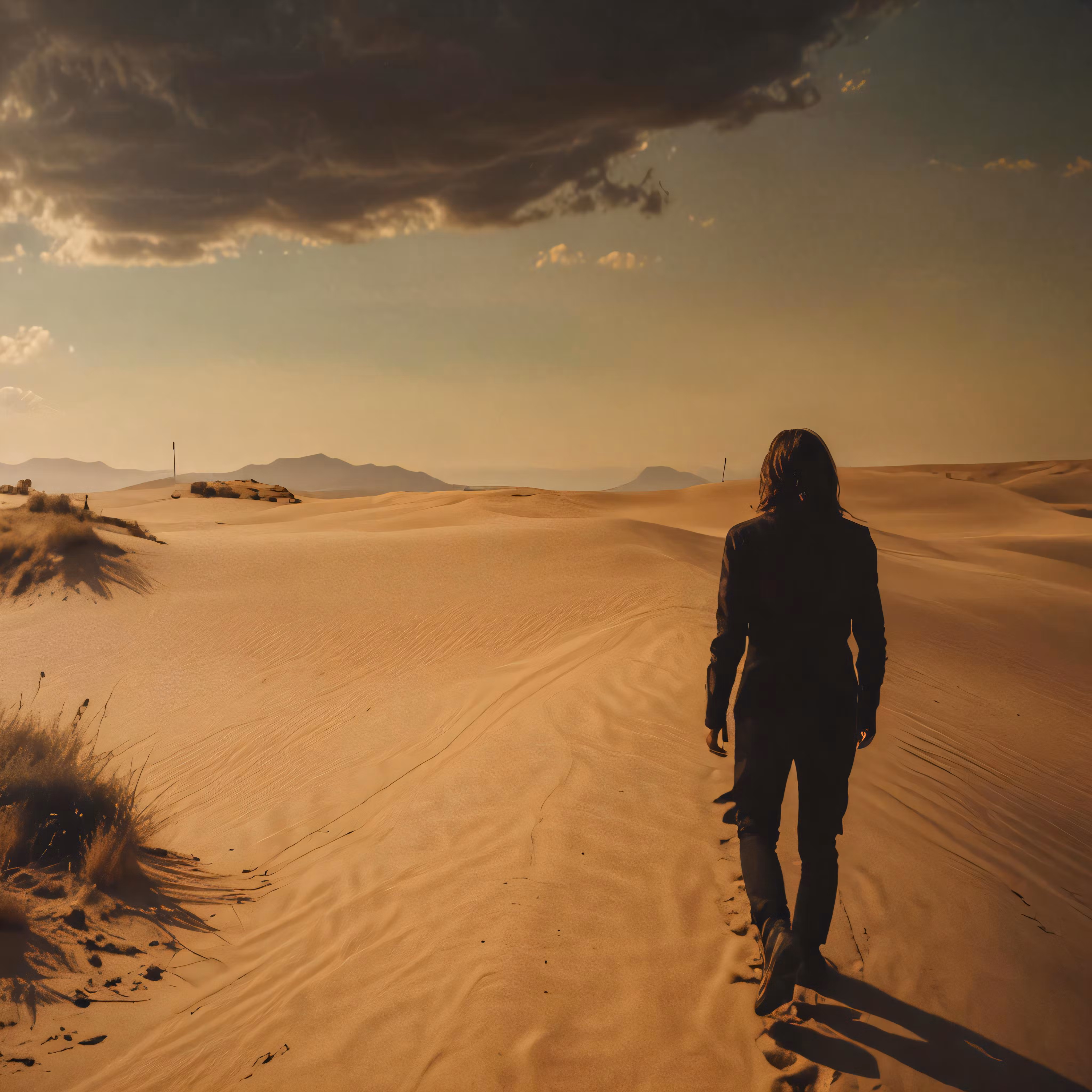 High resolution picture, free to use, the official logo for the 50 /man walking through desert on dark cloudy day