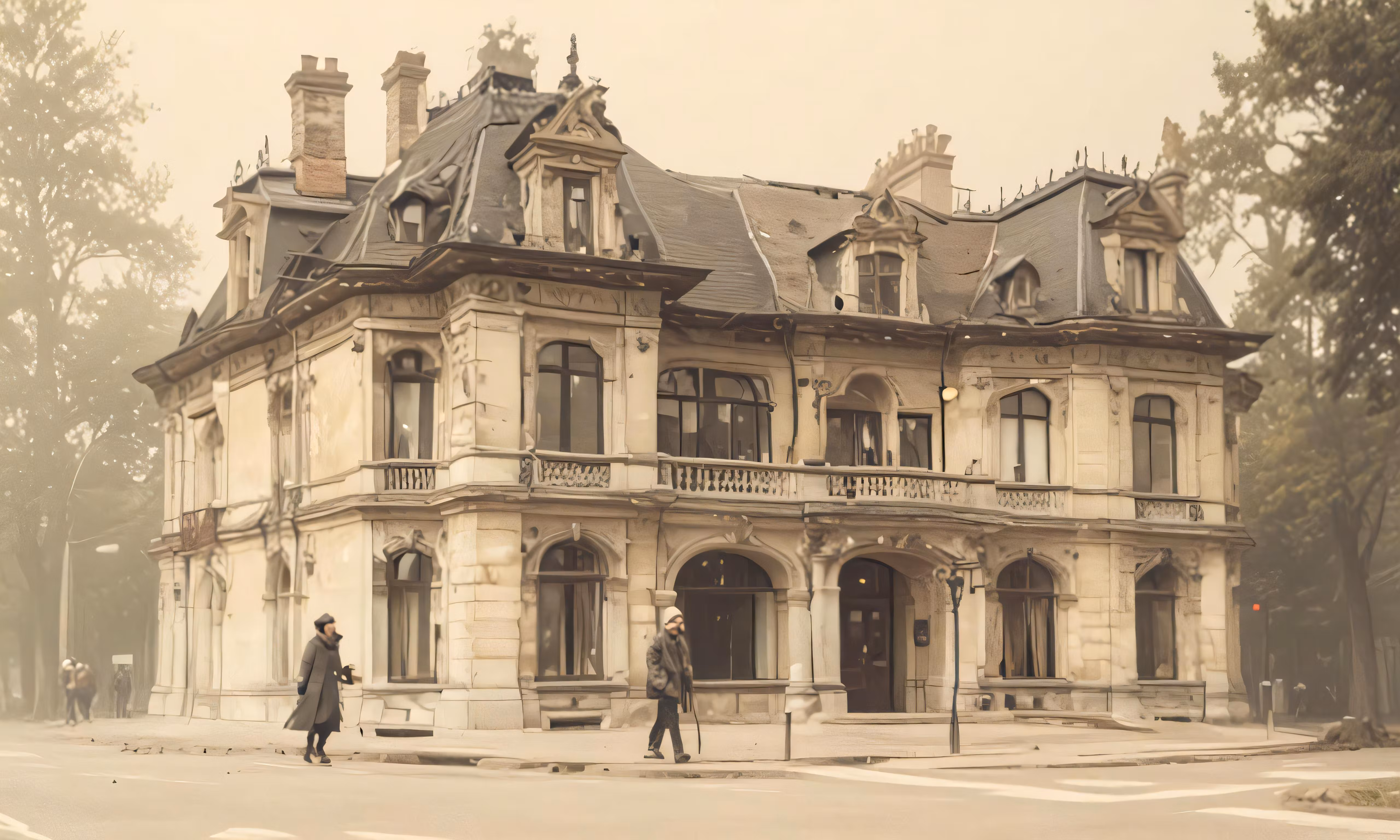 High resolution picture, free to use, the official logo for the 50 /old fashioned building with two people on street corner