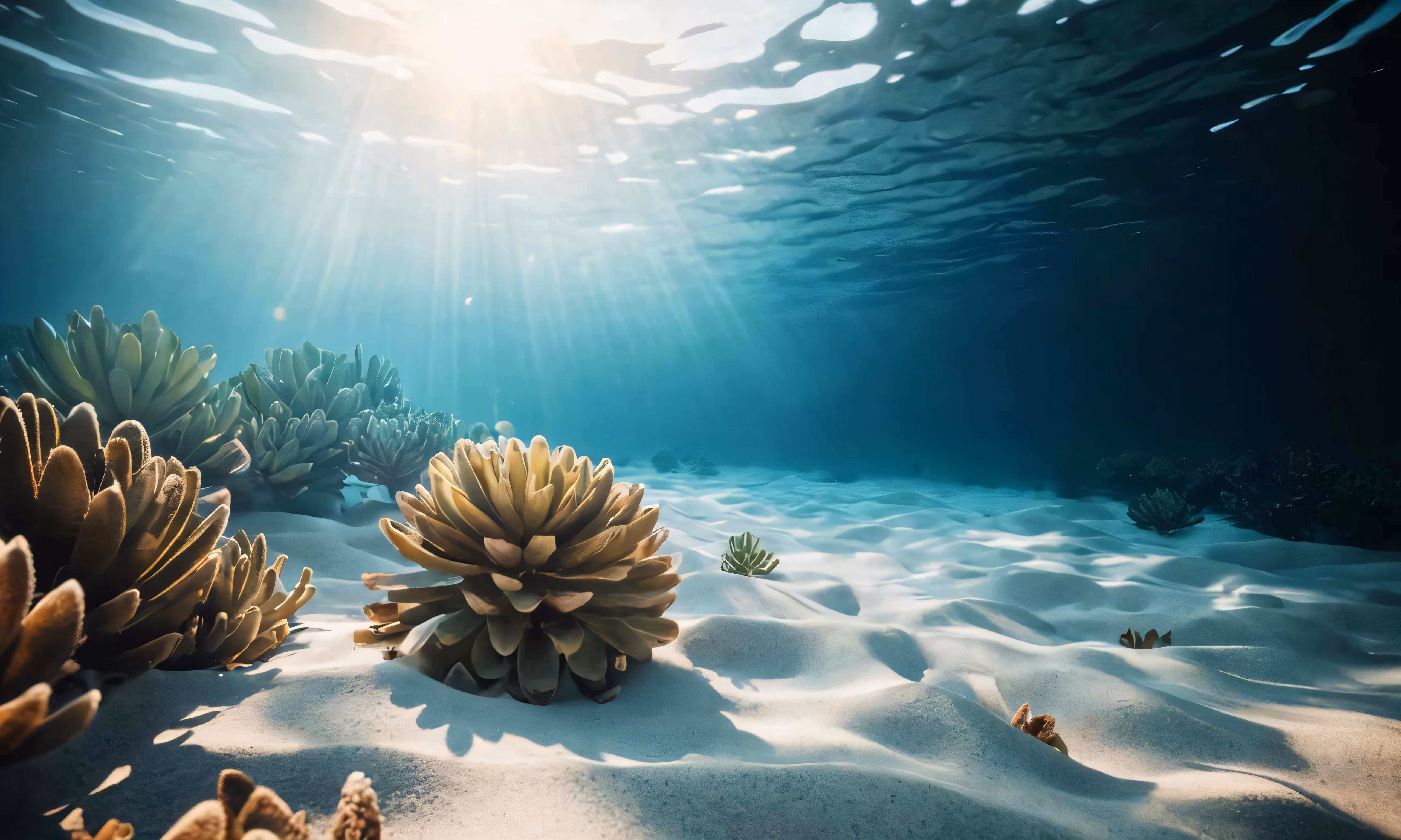 High resolution picture, free to use, the official logo for the 50 /sea weed is growing on the bottom of an underwater coral