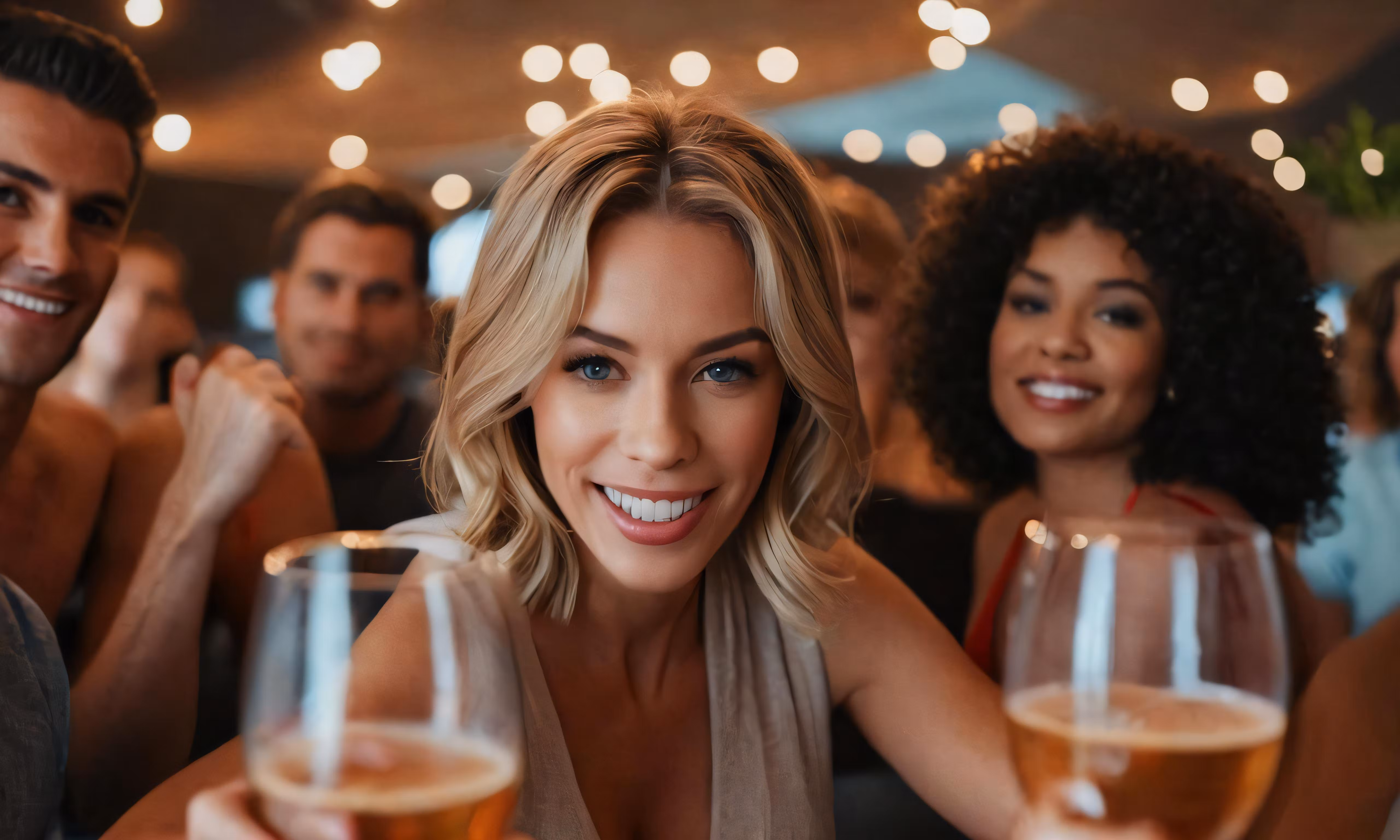 High resolution picture, free to use, the official logo for the 50 /some friends are smiling and drinking a beer