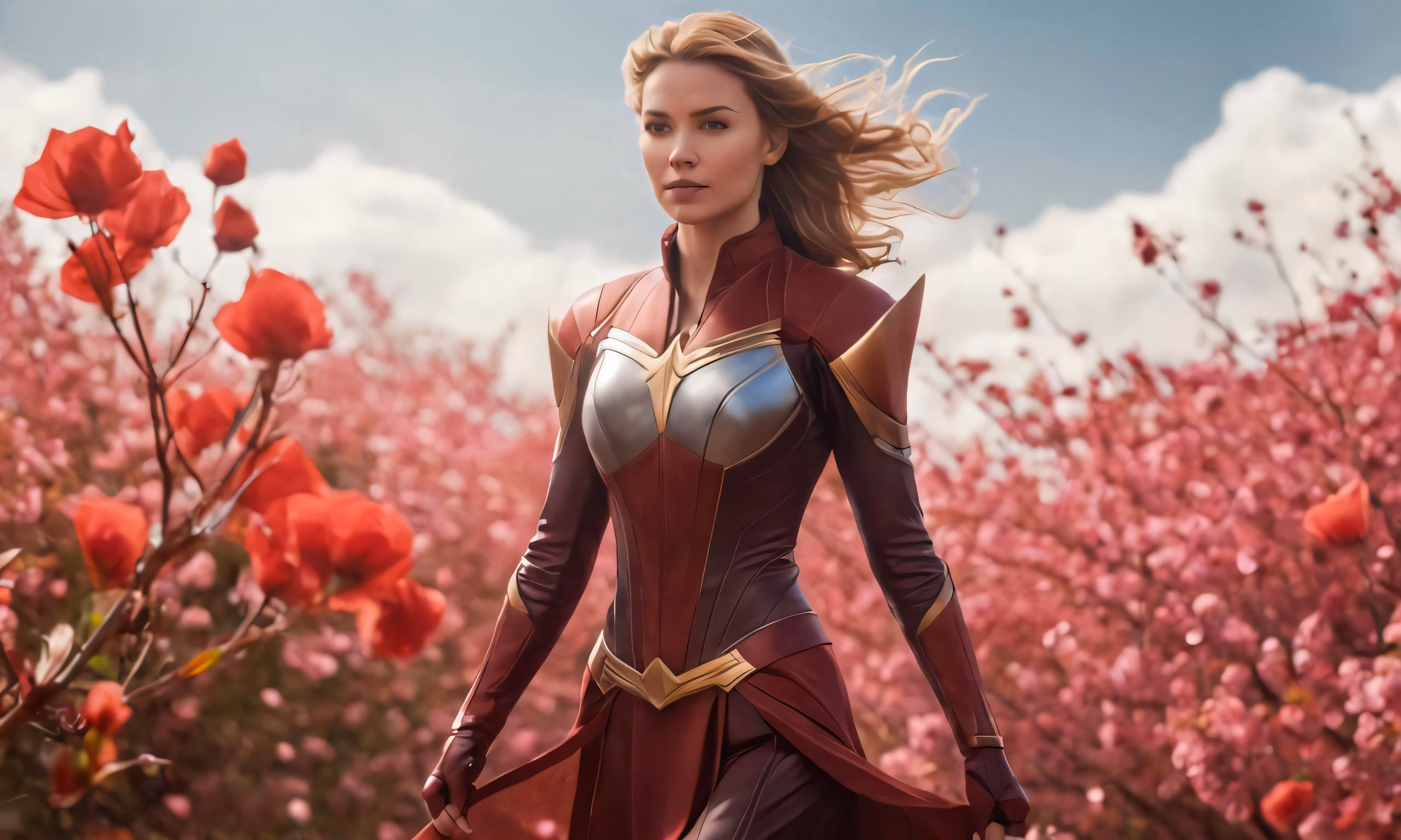 High resolution picture, free to use, the official logo for the 50 /the captain comics movie characters in costumes standing near red flowers