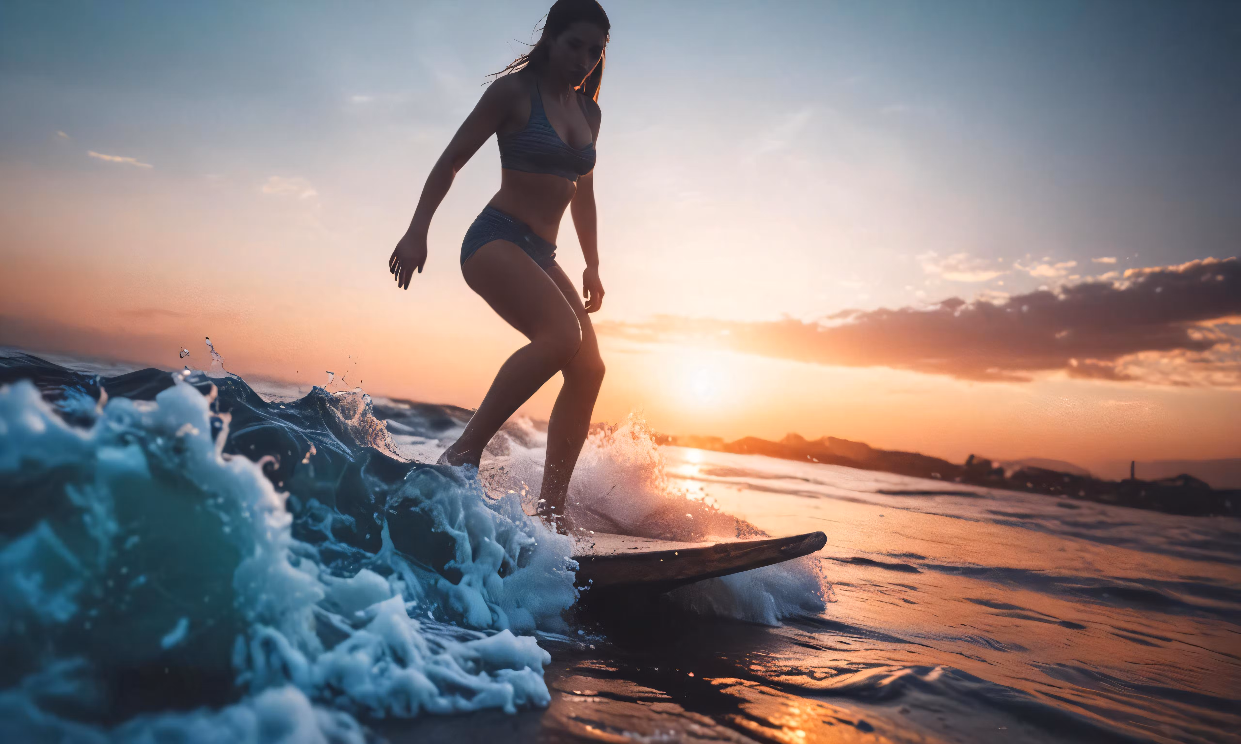 High resolution picture, free to use, the official logo for the 50 /the girl is on her surfboard riding an ocean wave