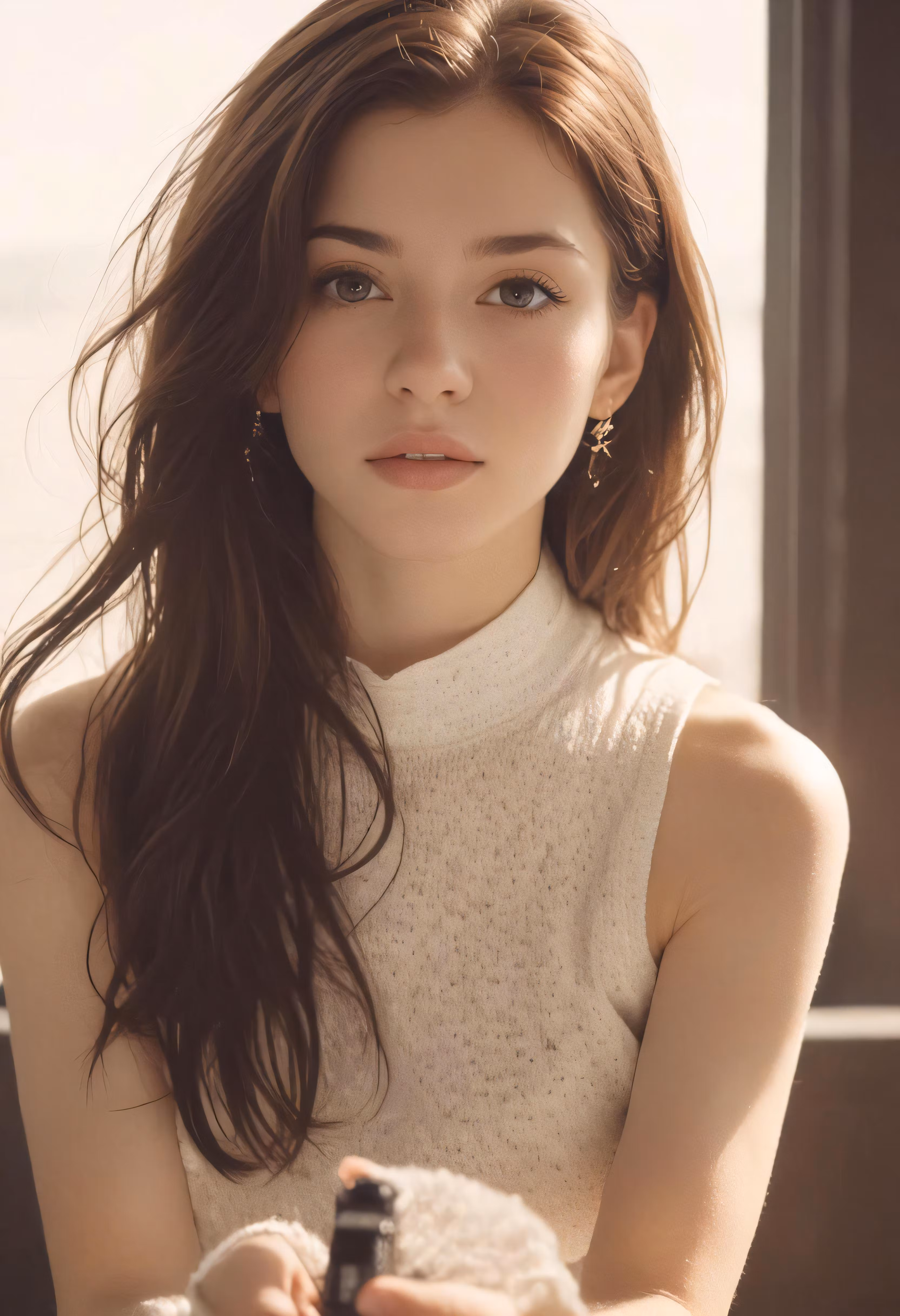 High resolution picture, free to use, the official logo for the 50 /the woman is posing in front of the window with a cell phone