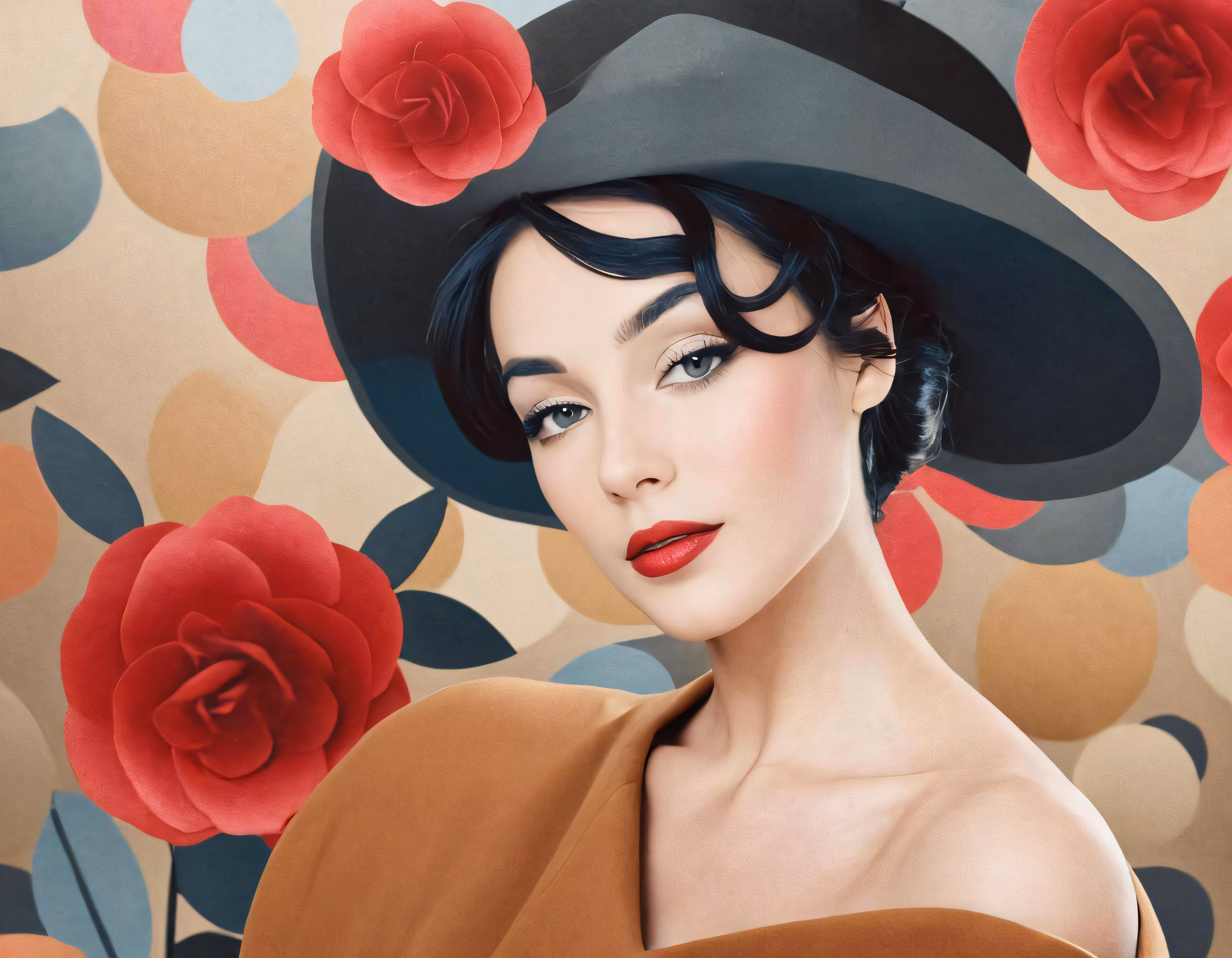 High resolution picture, free to use, the official logo for the 50 /the woman is wearing a black hat and dress