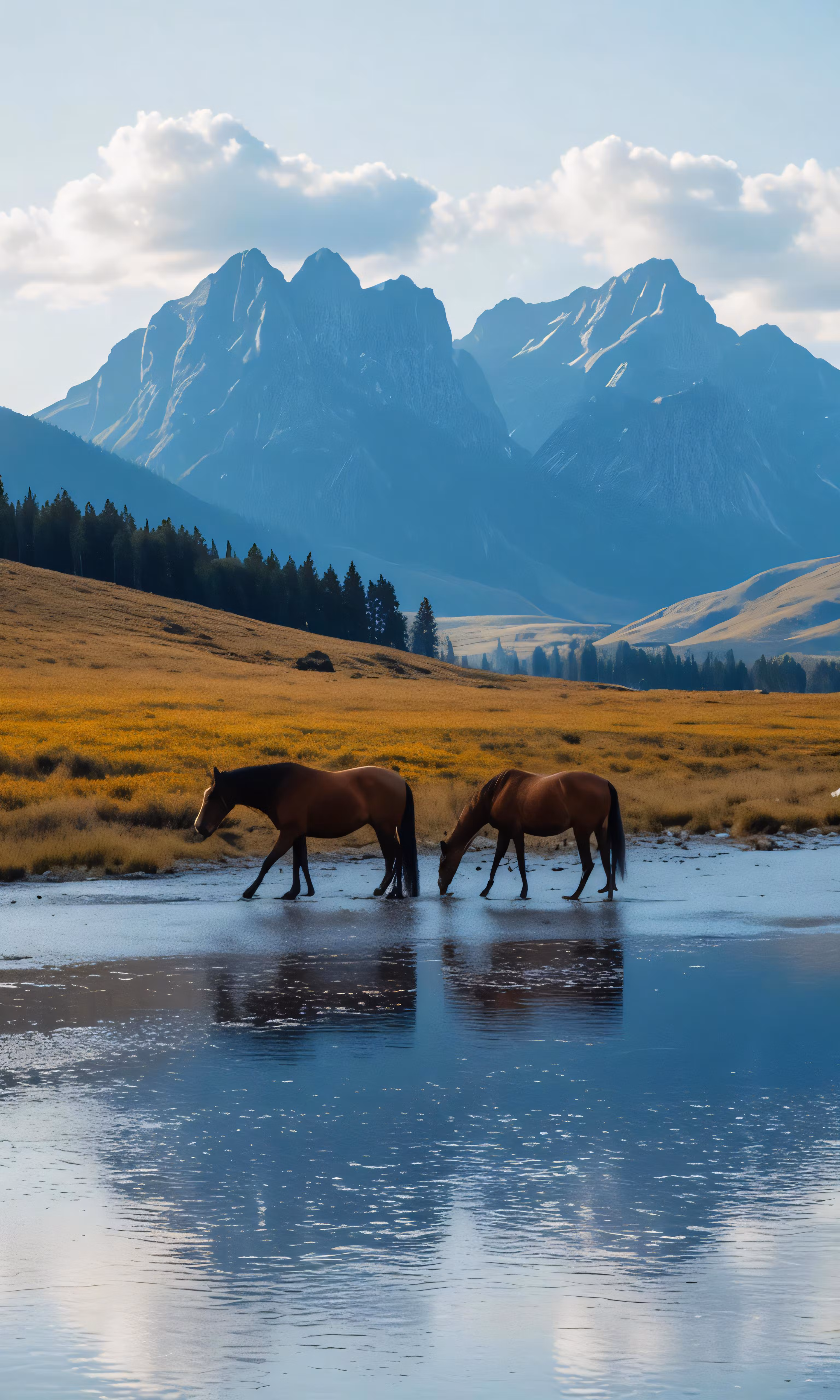 High resolution picture, free to use, the official logo for the 50 /three horses stand close together by a lake