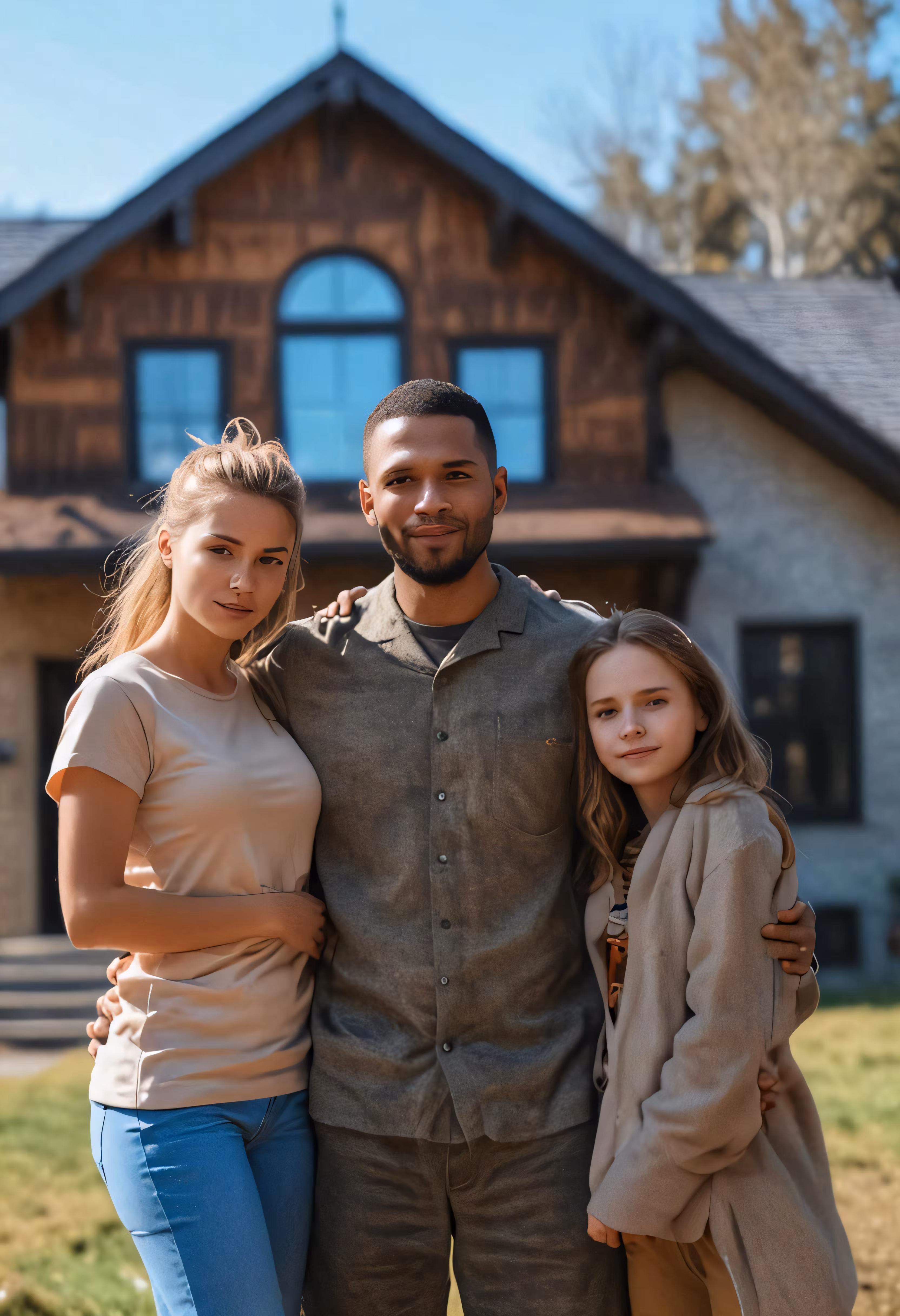High resolution picture, free to use, the official logo for the 50 /two adults and a child standing in front of a large house