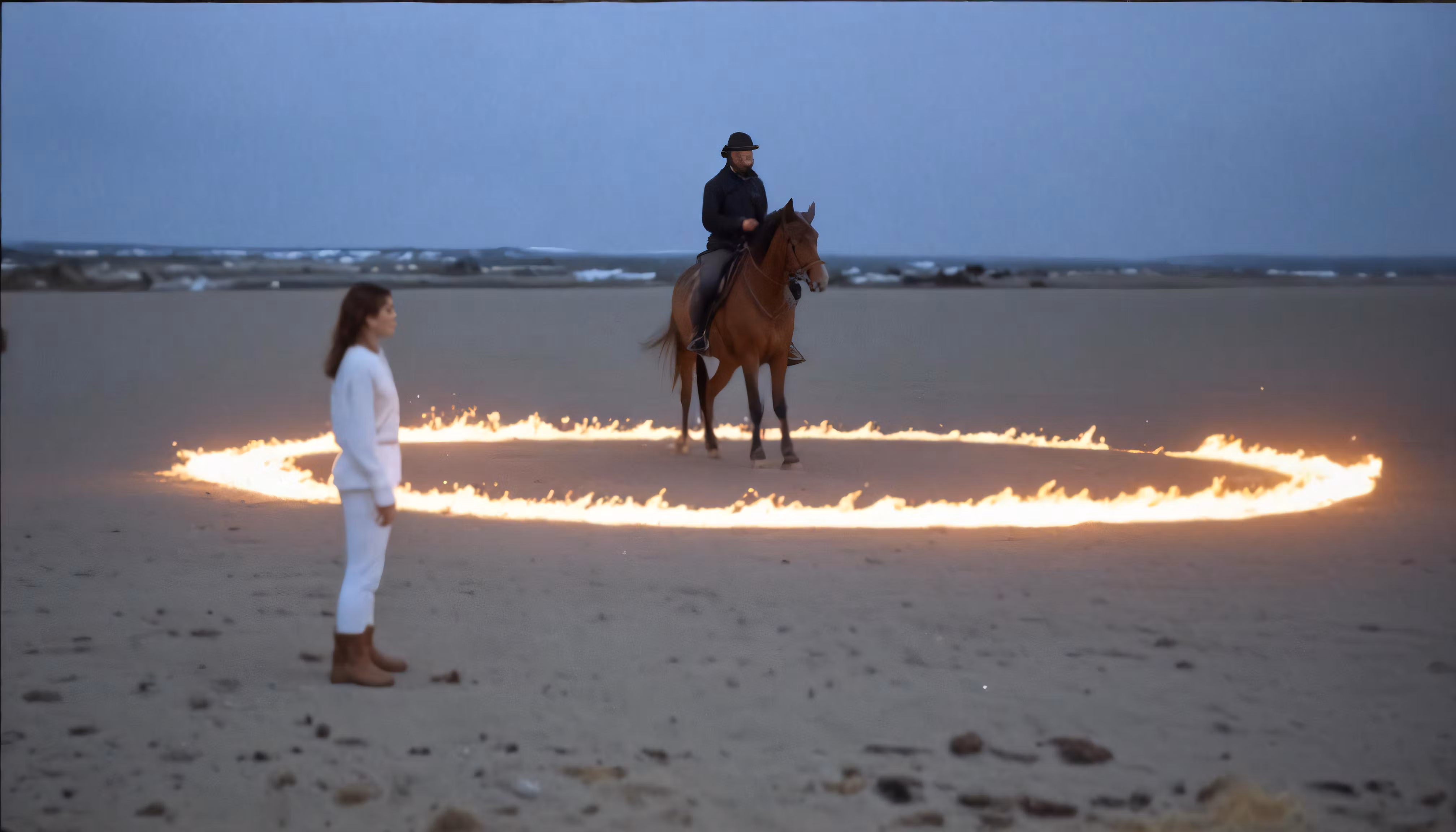 High resolution picture, free to use, the official logo for the 50 /two horses and riders, one is fully clothed with flames