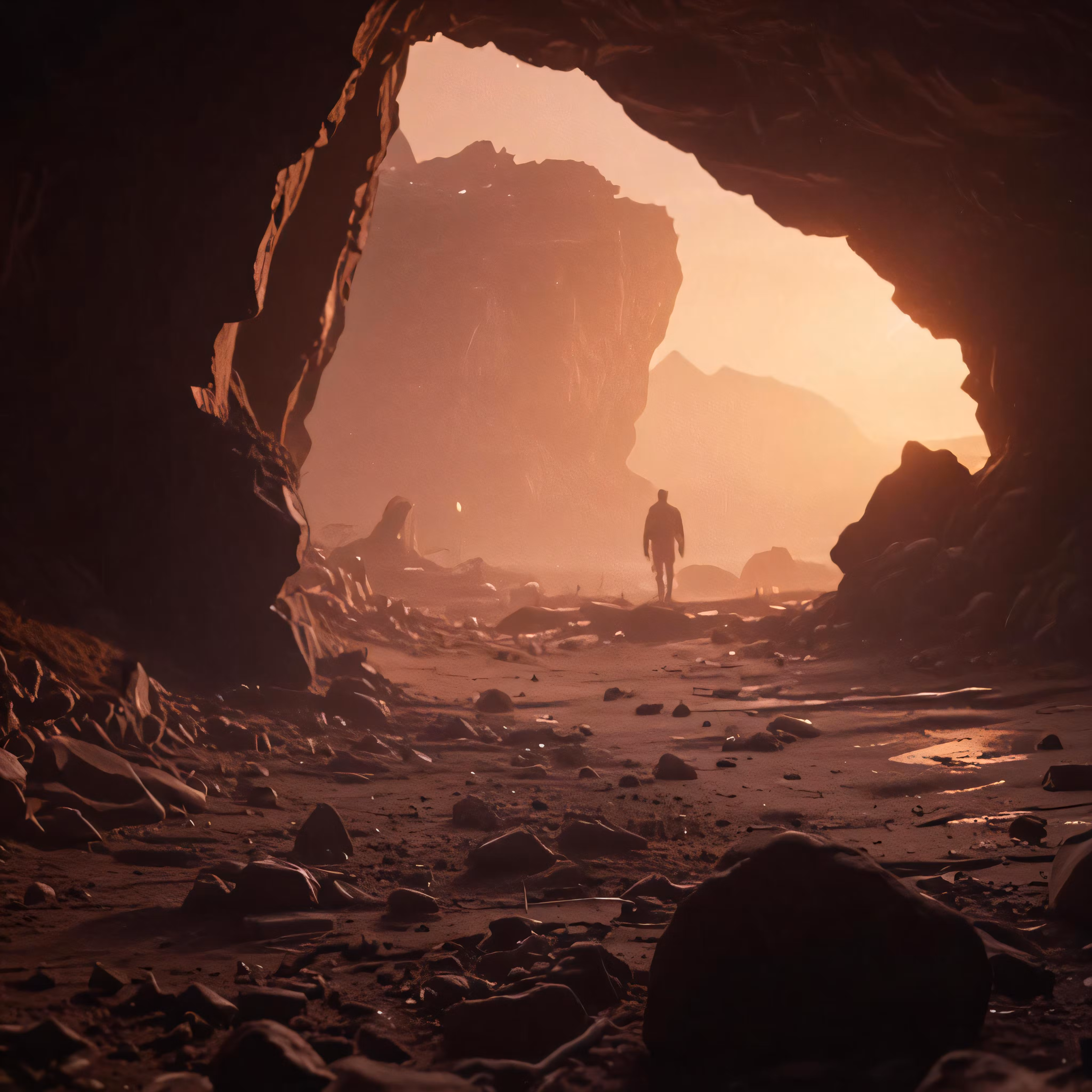 High resolution picture, free to use, the official logo for the 50 /two people walking out from a cave on an arid surface