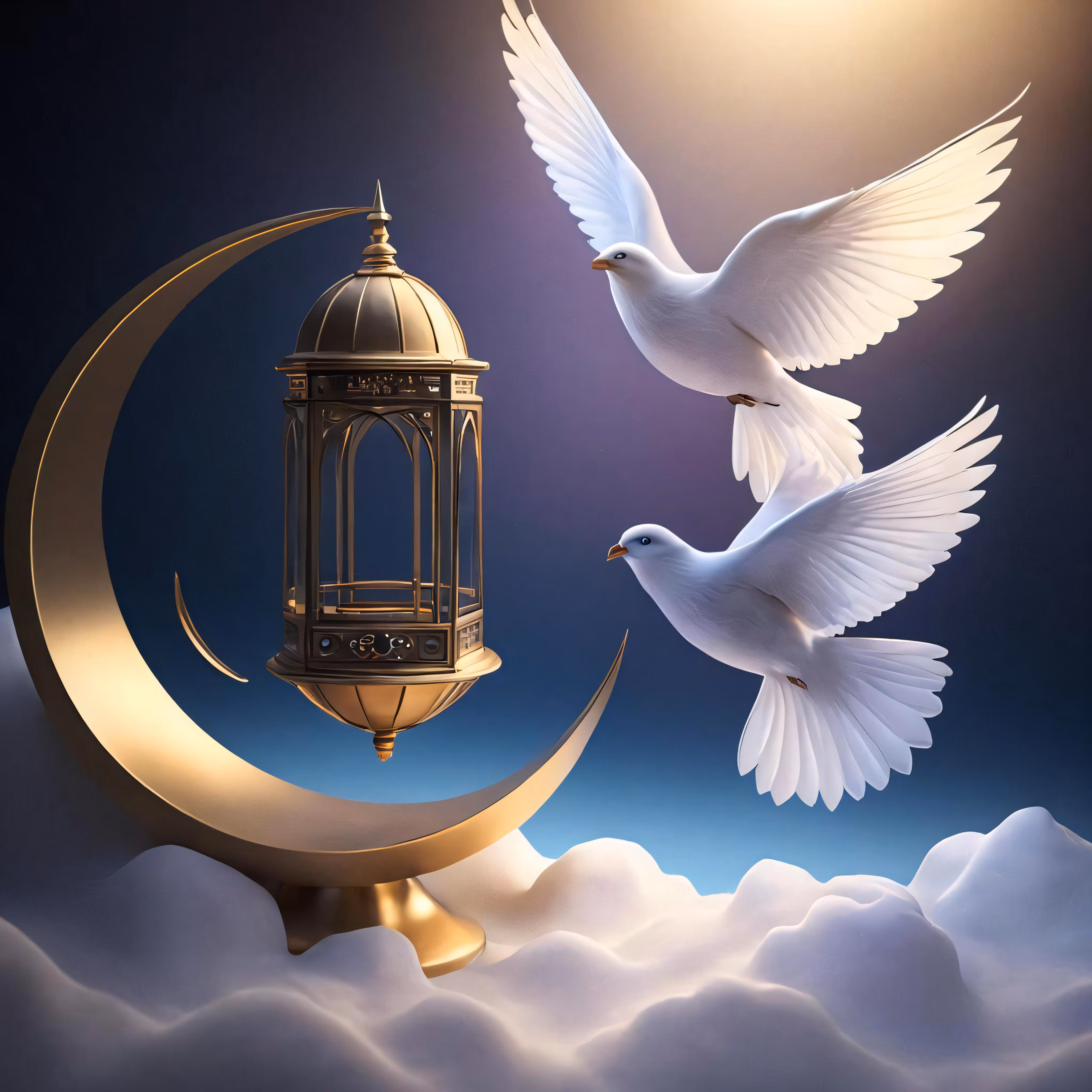High resolution picture, free to use, the official logo for the 50 /two white birds flying next to an ornate lantern