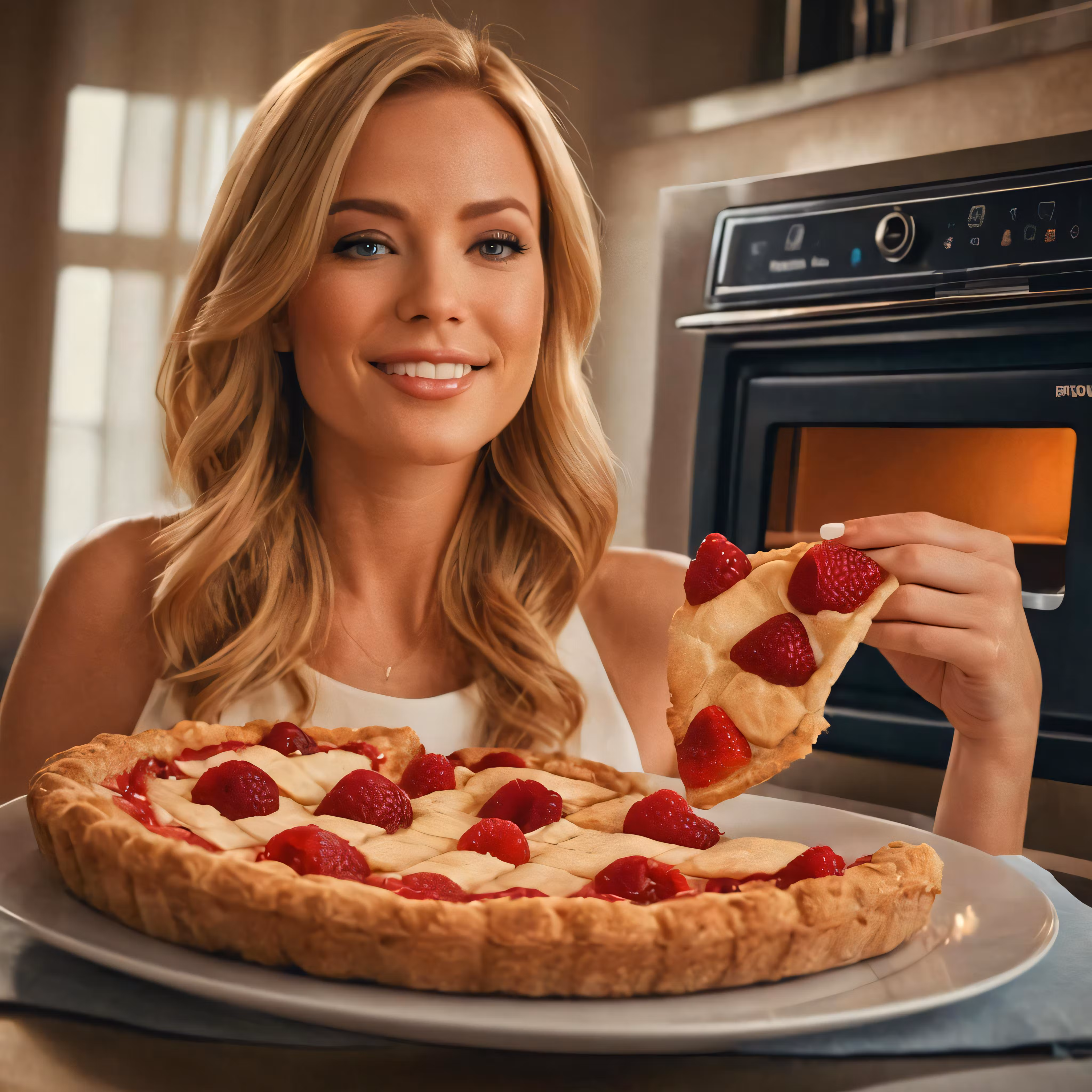 High resolution picture, free to use, the official logo for the 50 /woman eating pie in a kitchen with a stove