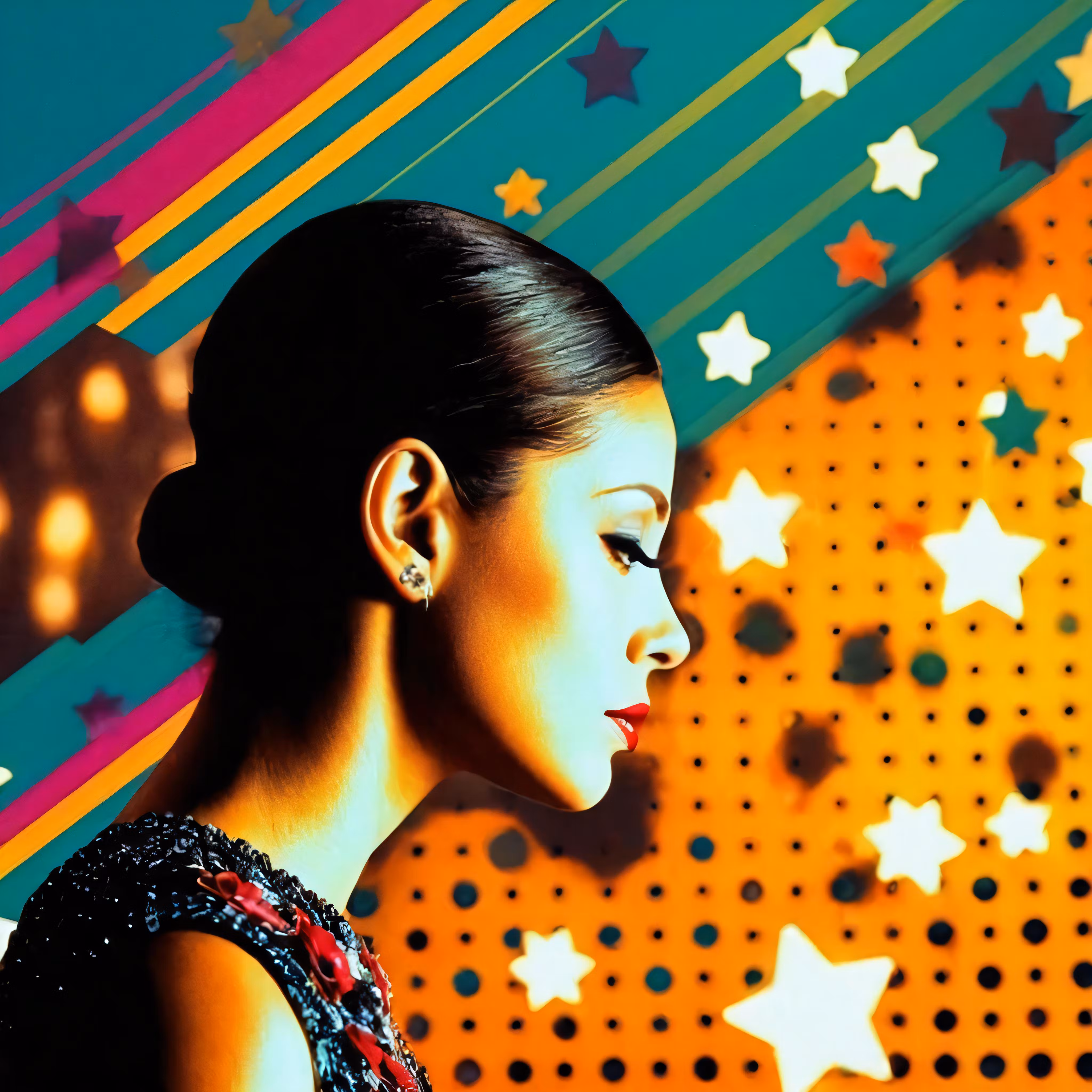 High resolution picture, free to use, the official logo for the 50 /woman in front of colored stars, looking away