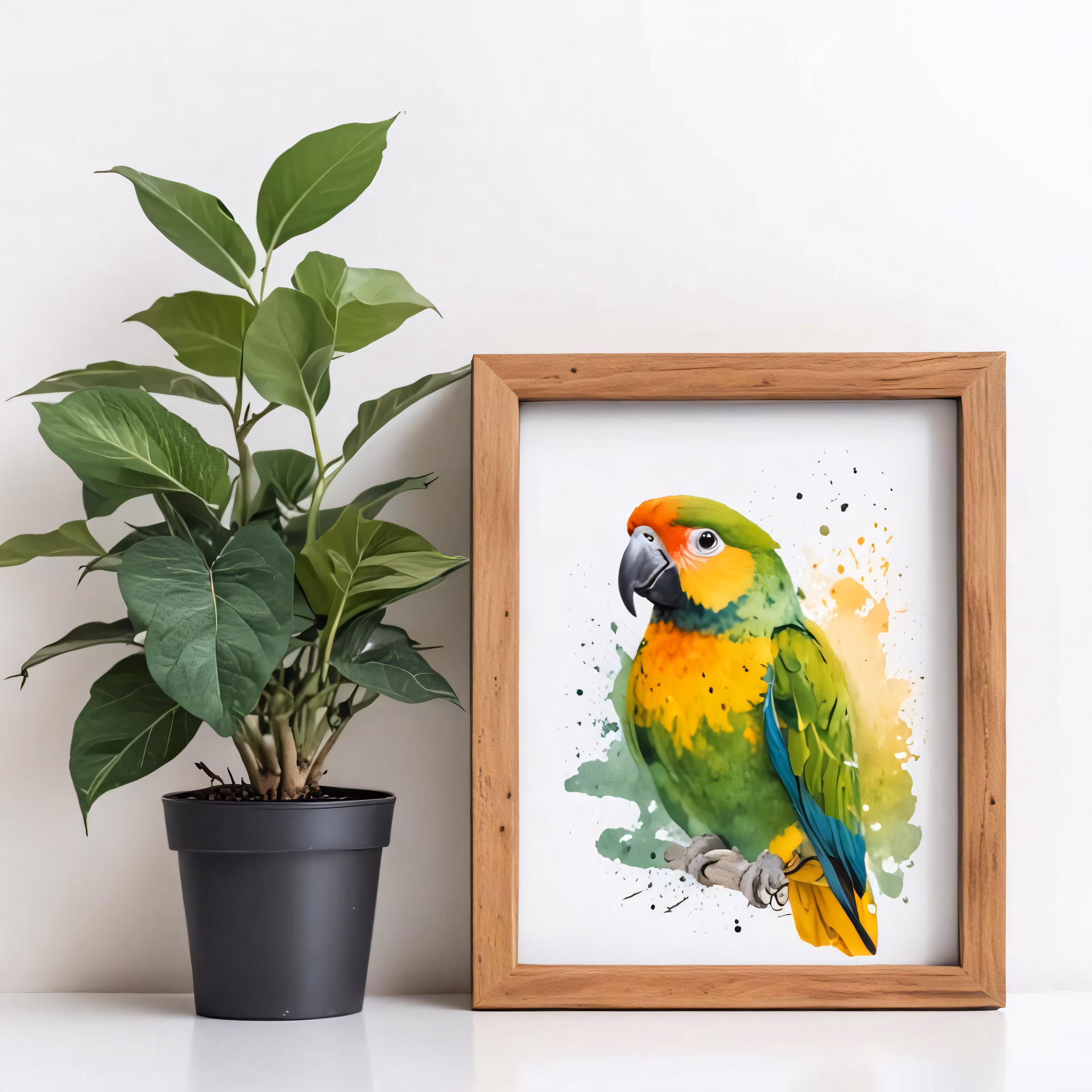 High resolution picture, free to use, the painting depicts a tropical parrot perched on a branch