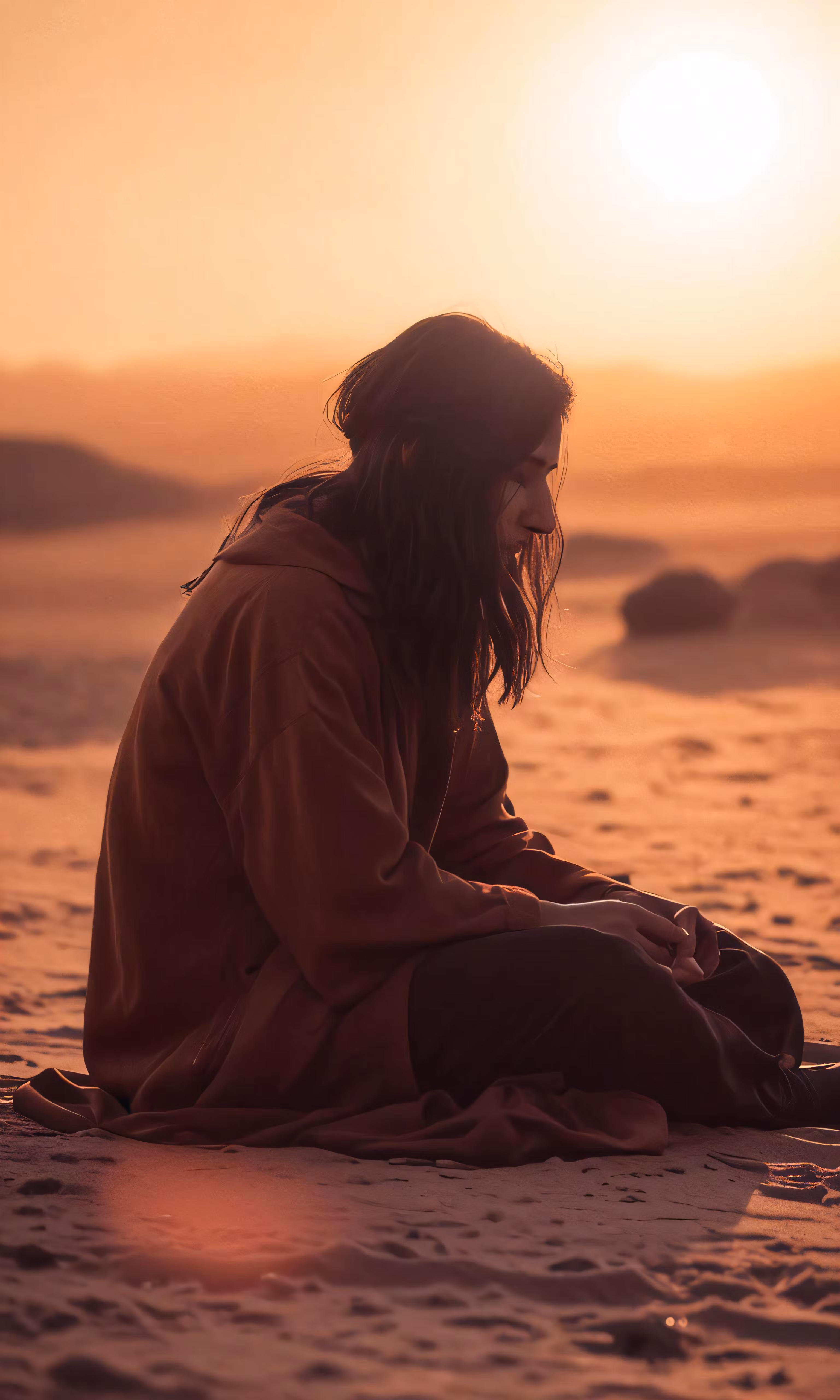 High resolution picture, free to use, the person is sitting on the beach looking at his phone