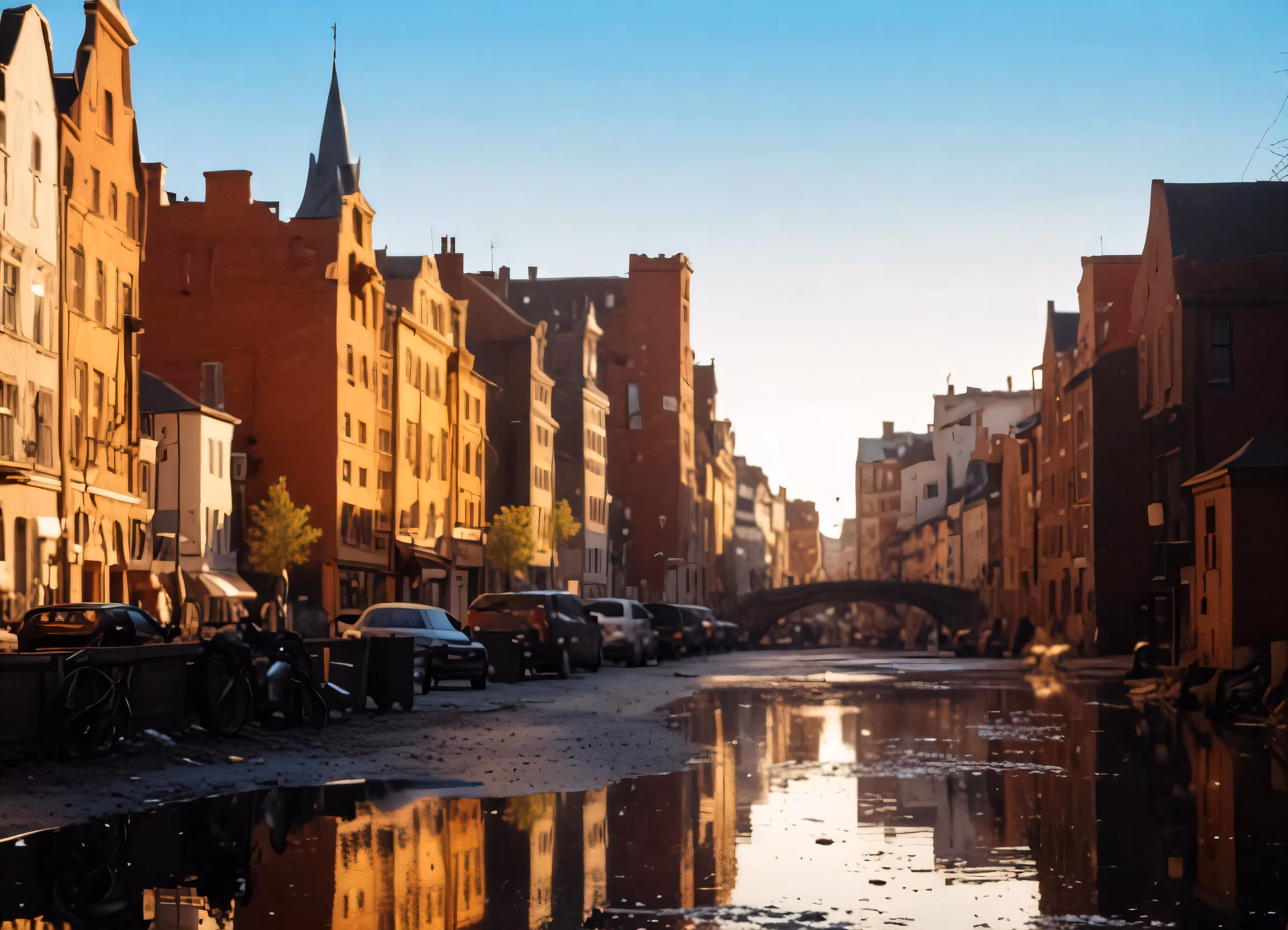 High resolution picture, free to use, the reflection of a bridge in the water shows a row of buildings