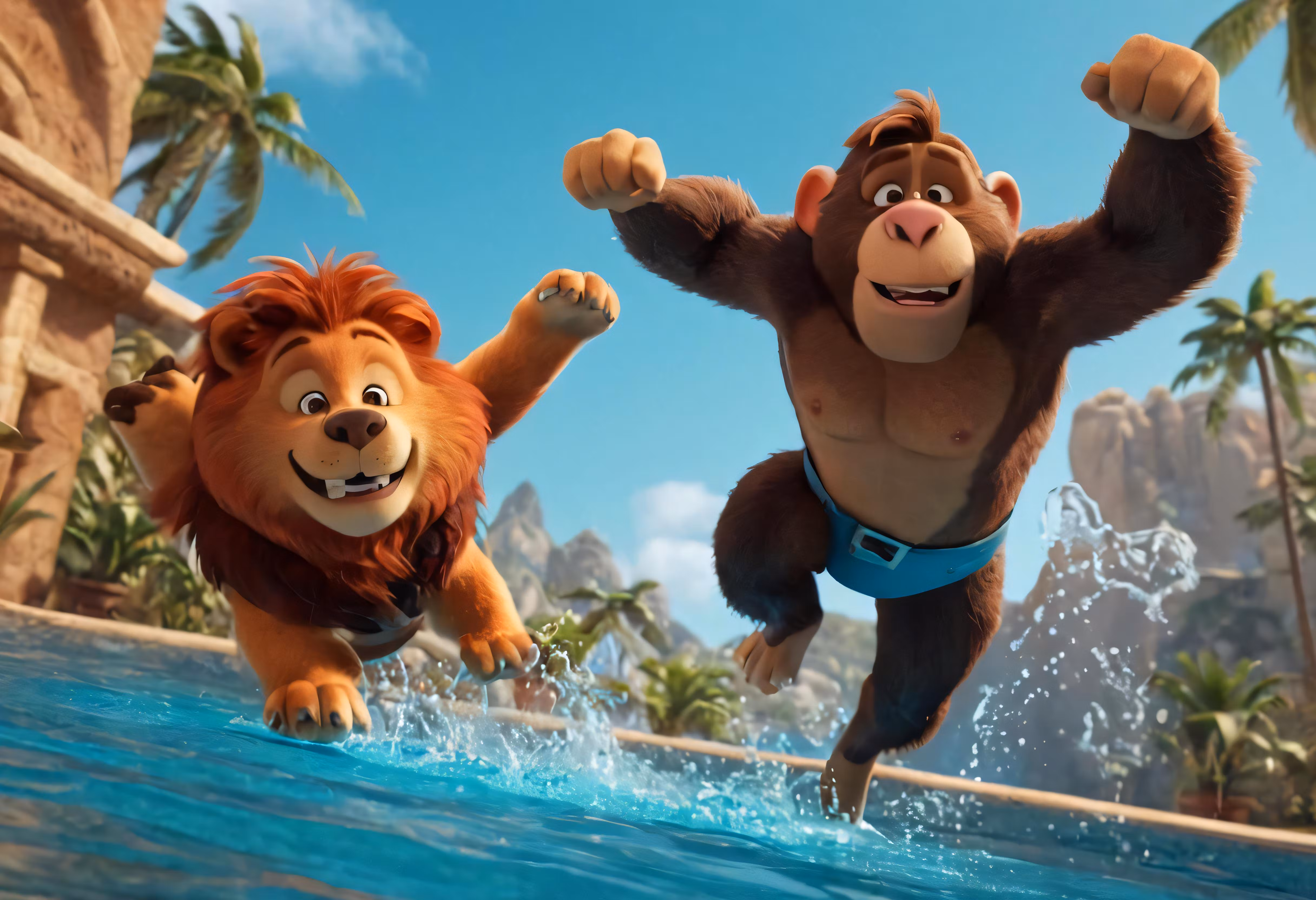 High resolution picture, free to use, the roar and a lion running in front of a mountain with palm trees